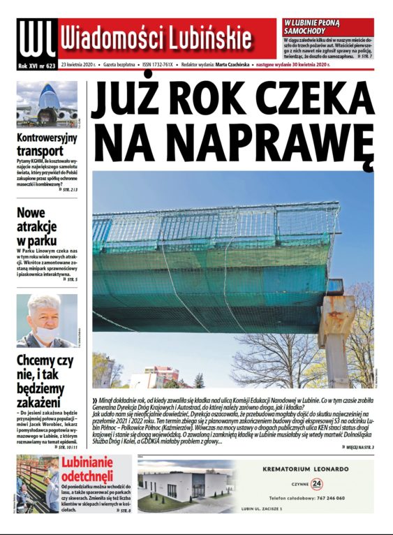 W nowym numerze najstarszego bezpłatnego lubińskiego tygodnika przeczytacie też między innymi o zbliżających się wyborach na prezydenta Polski oraz braku chętnych do pracy w komisjach wyborczych, o transporcie największym samolotem świata kupionych przez KGHM maseczek ochronnych oraz kombinezonów, zmianach w rozkładzie jazdy pociągów Kolei Dolnośląskich, nowych atrakcjach w parku Leśnym, które pojawią się po zakończeniu epidemii, oraz o powrocie do nowej normalności zaplanowanym przez rząd.