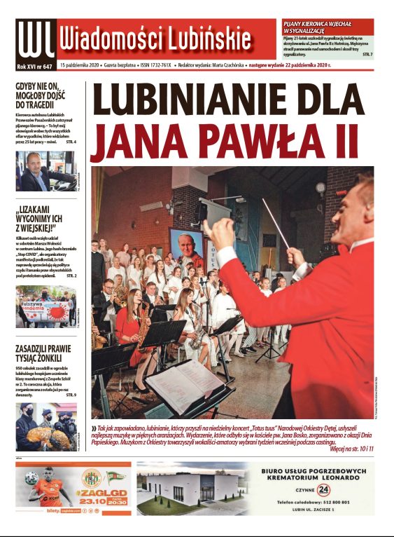 Między innymi o koncercie Narodowej Orkiestry Dętej poświęconym papieżowi Janowi Pawłowi II piszemy w najnowszym numerze „Wiadomości Lubińskich”, który ukaże się już jutro, 15 października.