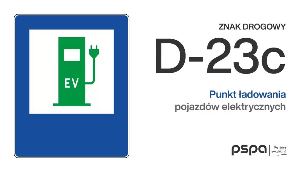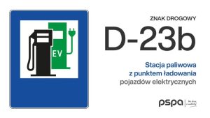 Znak D-23b zapowiada stację paliwową z punktem ładowania pojazdów elektrycznych, a D-23c wskazuje miejsce, gdzie znajduje się sama ładowarka.