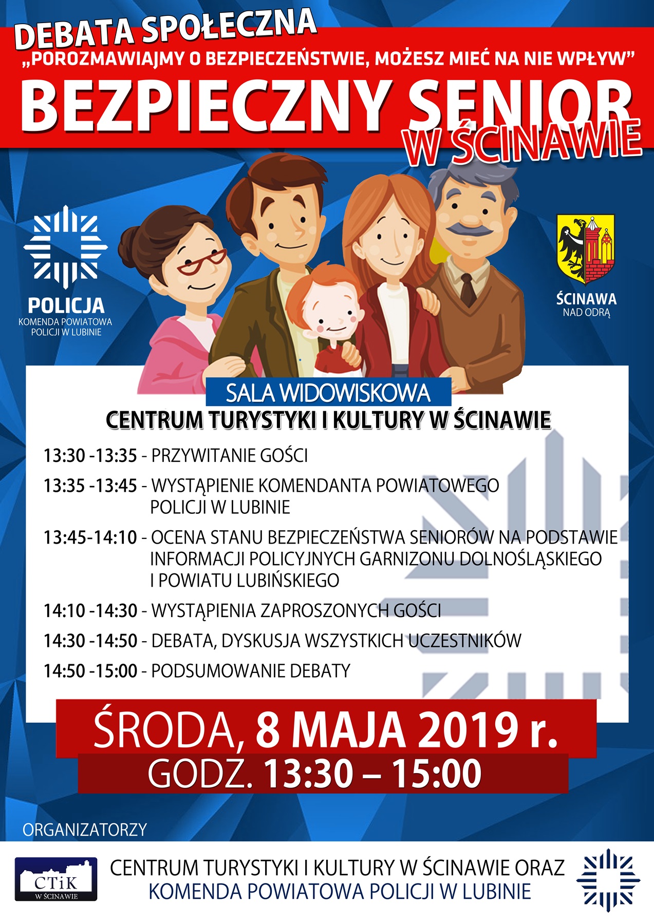 Spotkanie organizują wspólnie Centrum Turystyki i Kultury w Ścinawie oraz Komenda Powiatowa Policji w Lubinie. Debata społeczna poświęcona będzie bezpieczeństwu seniorów. Przyjść może każdy. Odbędzie się ona 8 maja o godzinie 13.30 w sali widowiskowej CTiK w Ścinawie.