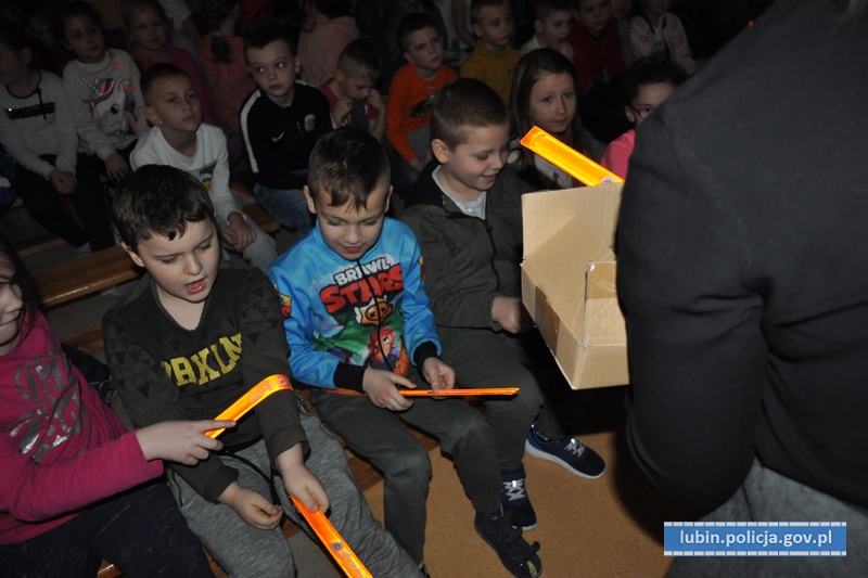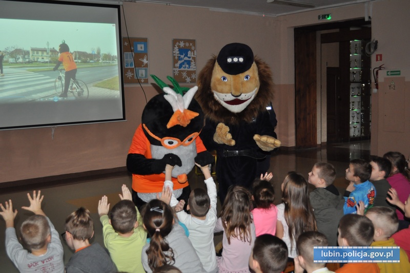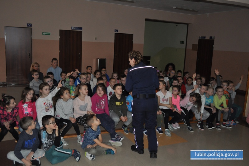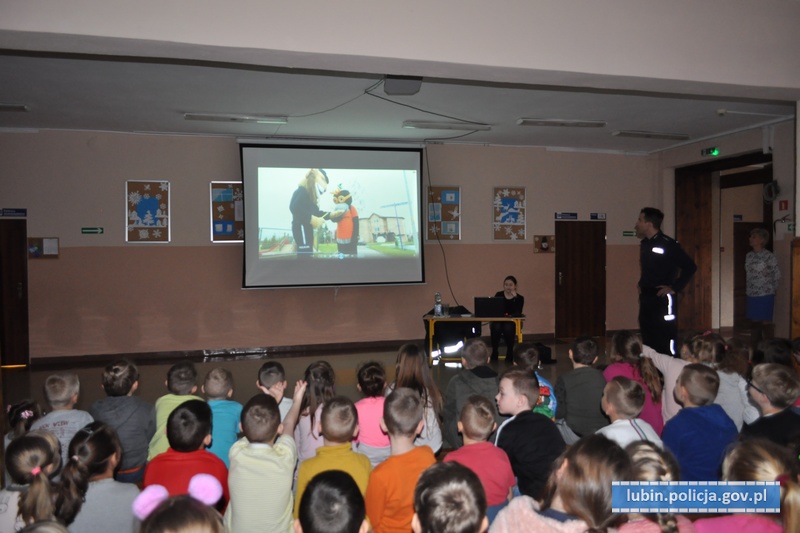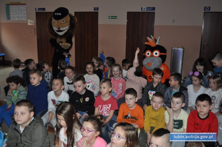 W spotkaniu, które odbyło się 22 stycznia, wzięło udział ponad 100 uczniów, którzy bardzo chętnie odpowiadali na zadawane pytania i z entuzjazmem reagowali na pokazywane scenki z maskotkami. Policjanci z lubińskiej komendy tłumaczyli oraz przypominali dzieciom, jak należy się zachowywać, by być bezpiecznym i nie powodować swoim zachowaniem sytuacji mogących zagrozić ich życiu i zdrowiu. Spotkane było bardzo dobrą okazją do omówienia bezpieczeństwa podczas ferii zimowych.