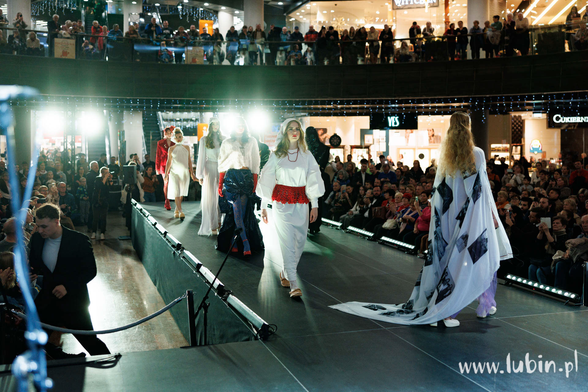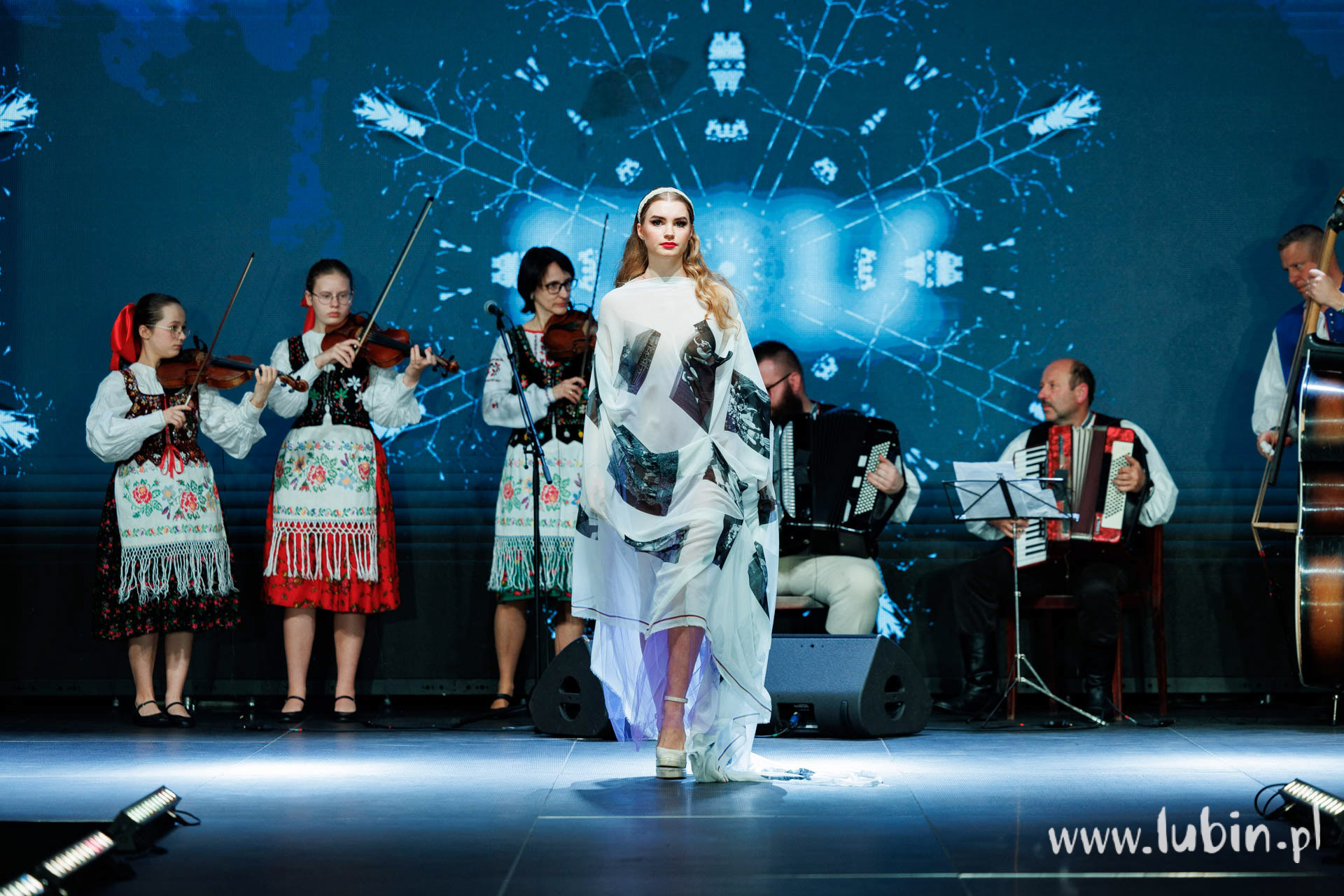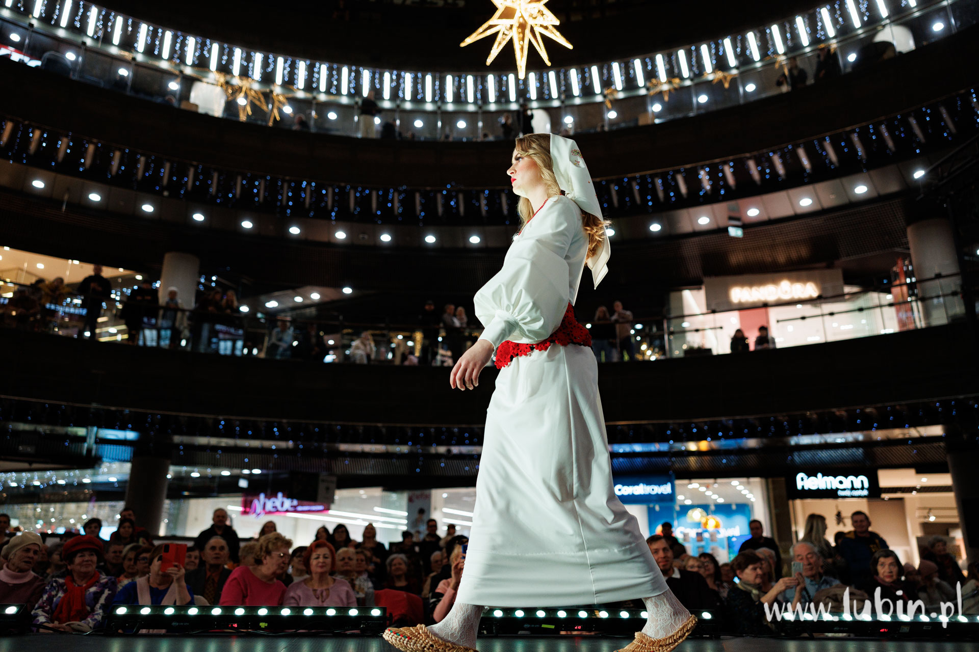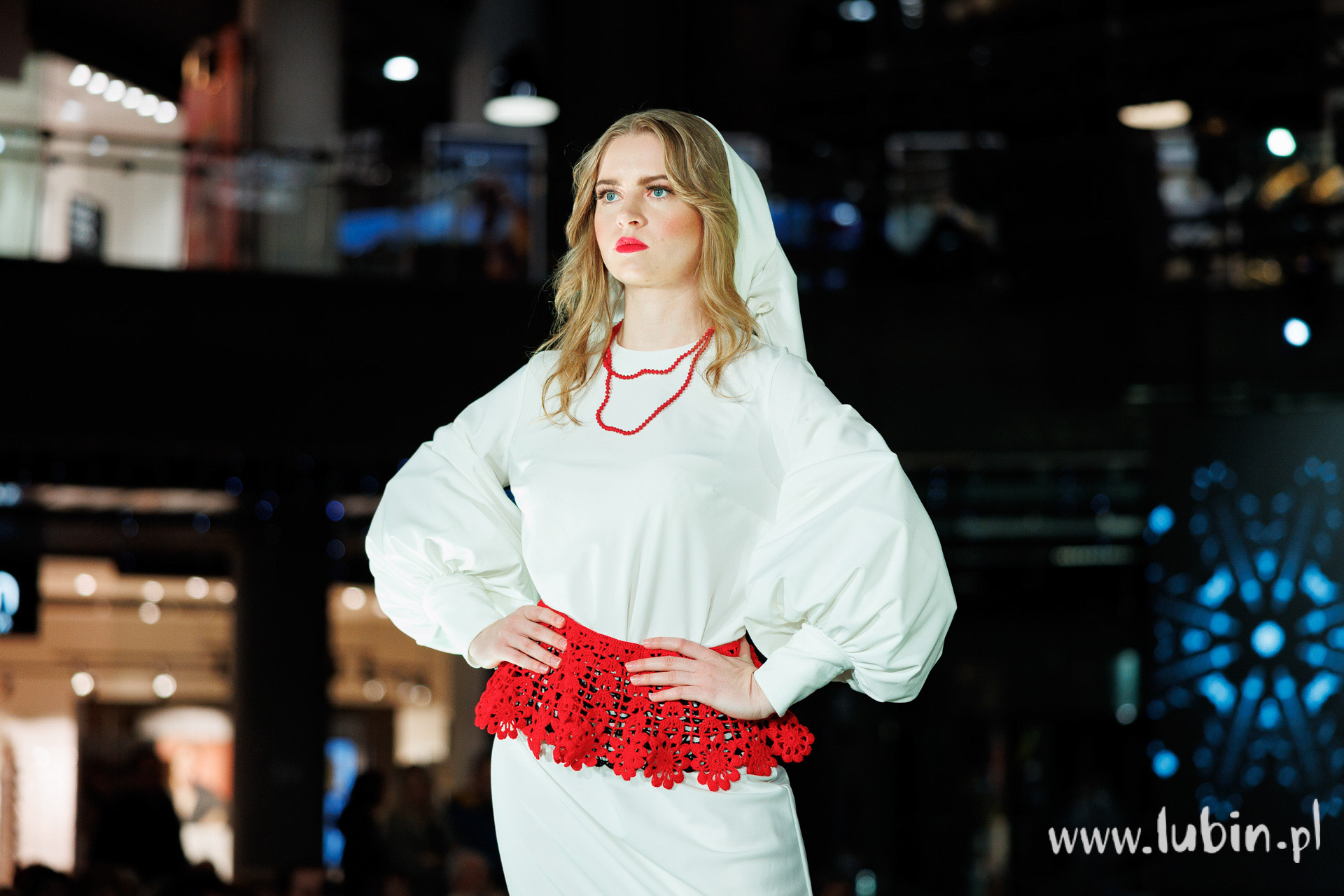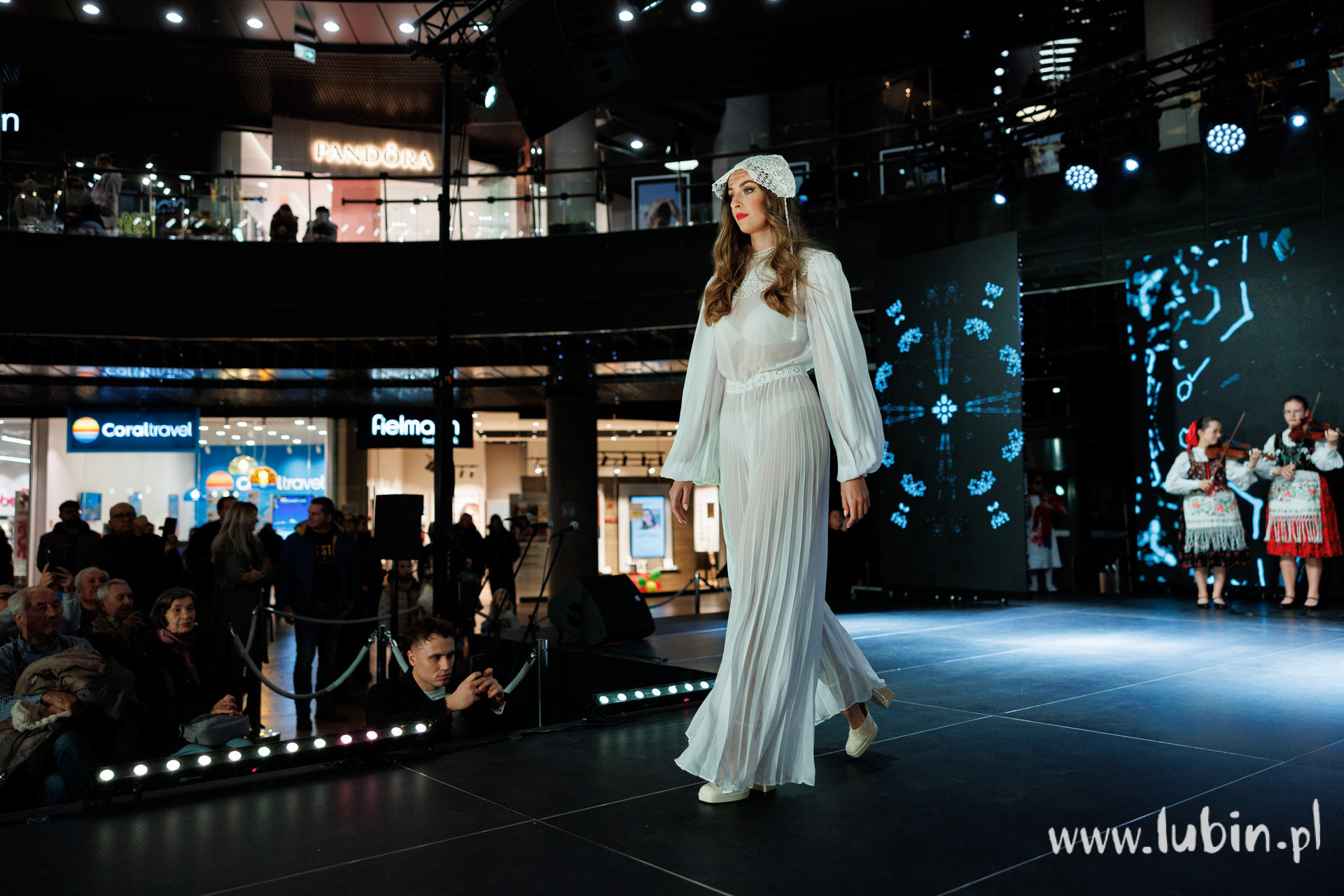 Dziś tej nowoczesności było całkiem sporo. CDT wyszło ze swoim przedsięwzięciem w przestrzeń galerii handlowej Cuprum Arena. W jej atrium stanęła scena i wybieg, na którym odbył się niezwykły pokaz mody i energetyczny koncert Łemkowskiego Zespołu Pieśni i Tańca „Łastiwoczka”. Publiczność zgromadziła się wokół sceny, a także na wyższych piętrach galerii, by na początek zobaczyć kolekcję „Rusynka” Anny Marii Zygmunt, inspirowaną tradycyjnymi ubiorami łemkowskimi.