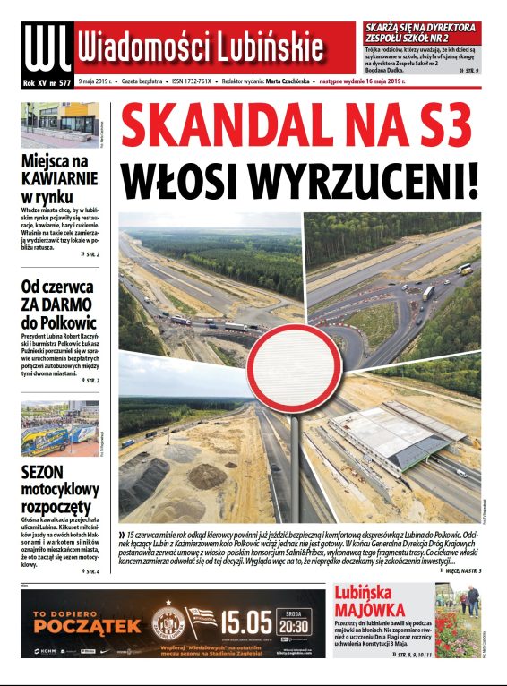 Tematem głównym najbliższego numeru „Wiadomości Lubińskich”, który ukaże się już jutro, 9 maja, będzie skandal na S3 i zerwanie umowy z wykonawcą wciąż niedokończonego odcinka Lubin – Polkowice. Ale piszemy nie tylko o tym.