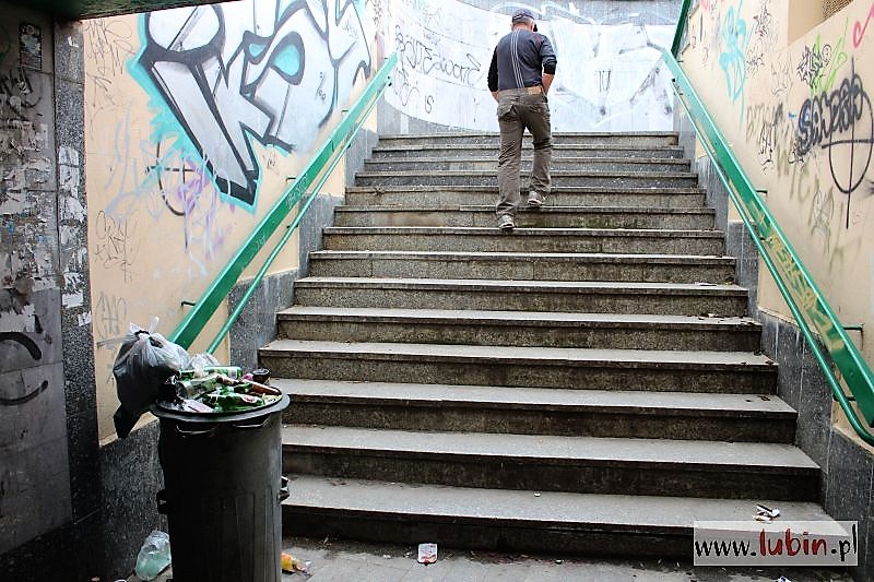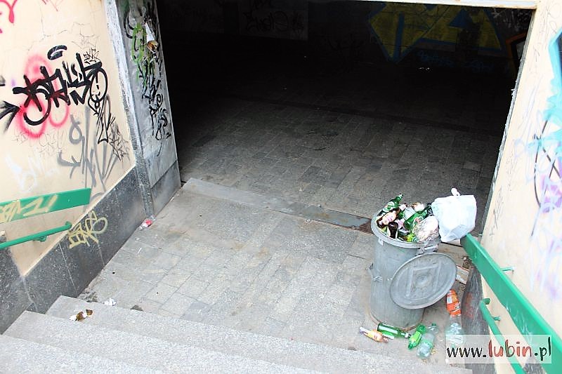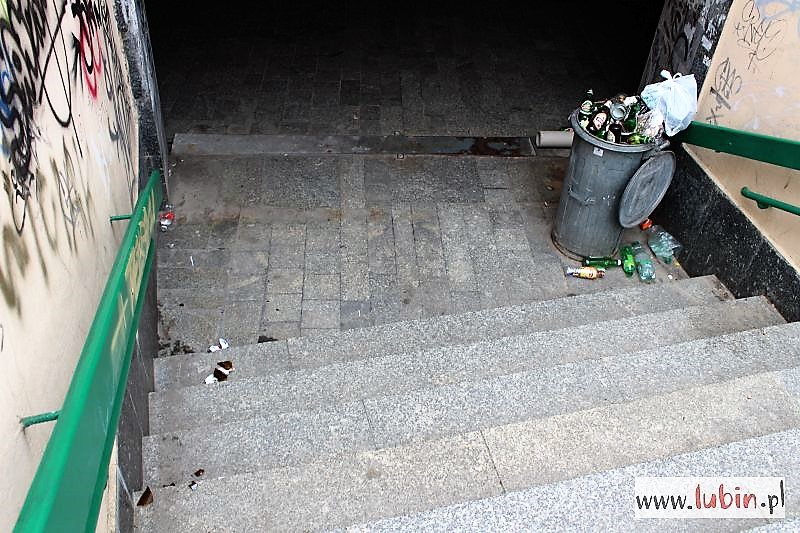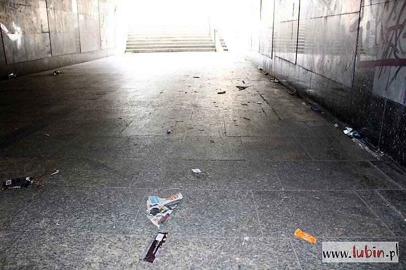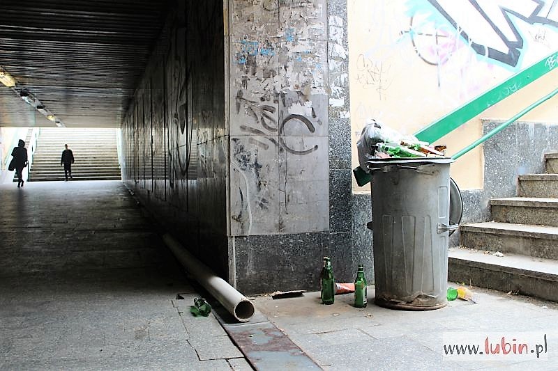 Puste butelki po alkoholu, potłuczone szkło, resztki jedzenia – tak dziś przed południem wyglądało przejście podziemne pod ulicą Komisji Edukacji Narodowej. – Bardzo wielu ludzi z niego korzysta, aż wstyd, żeby publiczne miejsce w środku miasta było tak zaśmiecone – narzeka lubinianin.
