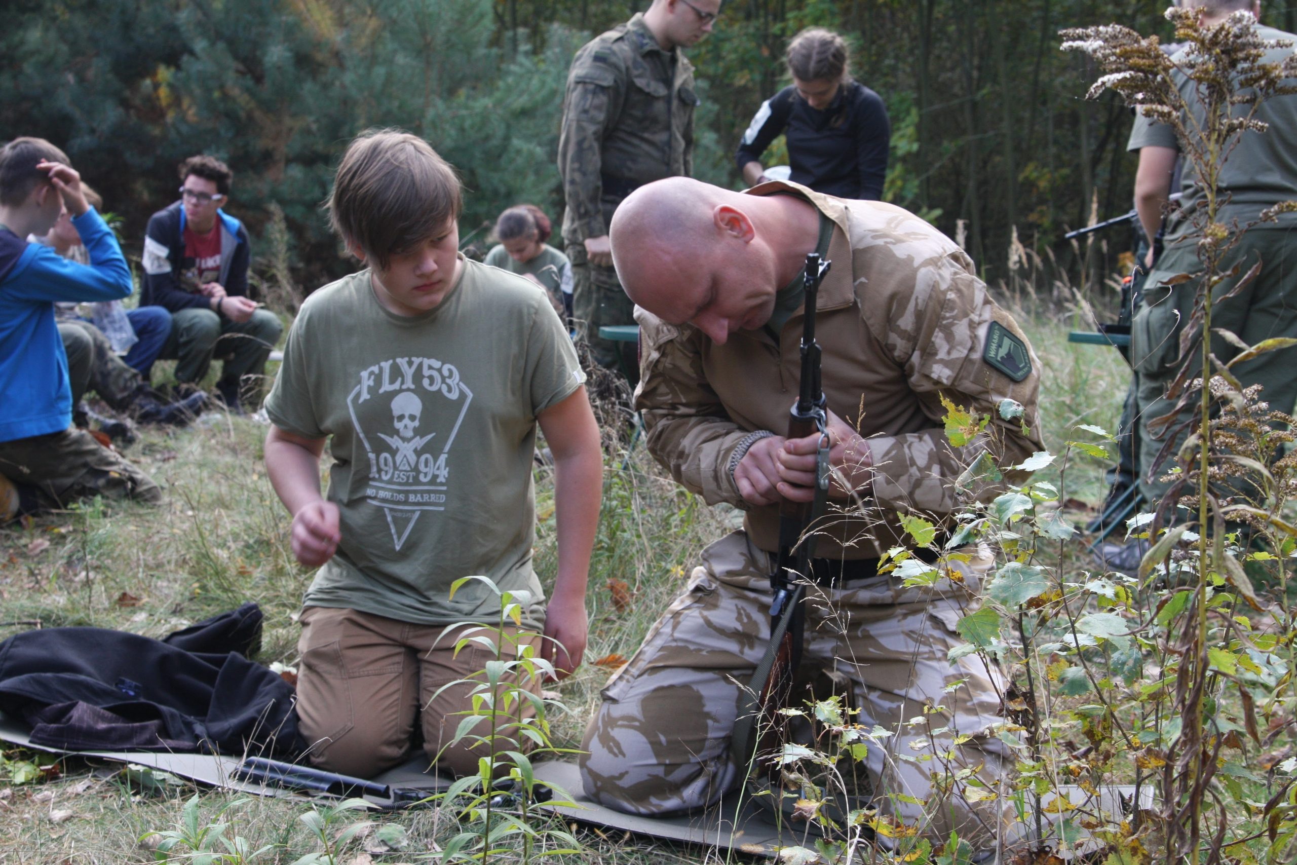 Harcerze zostali przeszkoleni z rozkładania i składania karabinu AK-47. Po tym nastąpiło sprawdzenie ich podstawowych umiejętności przydatnych na polu walki. Na czterech stacjach drużyny walczyły o punkty wliczane do punktacji. Każda drużyna musiała zaliczyć: strzelanie z broni pneumatycznej, strzelanie z łuków, rzut granatem oraz rozkładanie i składanie karabinu AK-47. Wszystko przebiegało pod bacznym okiem instruktorów. Po pokonaniu wszystkich punktów toru, drużyna miała czas na dokończenie rozkładania namiotów i zjedzenie posiłku. Później nastąpiło szkolenie z maskowania. Wszyscy dostali 30 minut na zamaskowanie się. Po tym czasie należało podejść w ukryciu do instruktorów, którzy stali na środku polany. Po udaniu się na odpowiedni dystans ekipa oddawała „strzał”, o czym powiadamiała przez radio. „Strzał” polegał na tym, że instruktor siedzący na środku polany podnosił kartkę, na której była jakaś litera lub cyfra. Drużyna musiała odczytać co jest na kartce, gdy jej się to udało – strzał był celny i wygrywała. Po tym wszystkim było ognisko z kiełbasą i śpiewem.