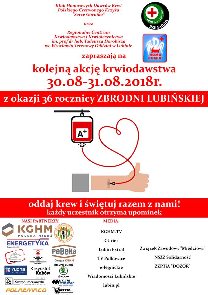 O tych, którzy zginęli, pamiętają również dawcy krwi. Klub Honorowych Dawców Krwi „Serce Górnika” działający przy ZG Lubin, zaprasza do uczczenia rocznicy Zbrodni Lubińskiej.