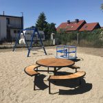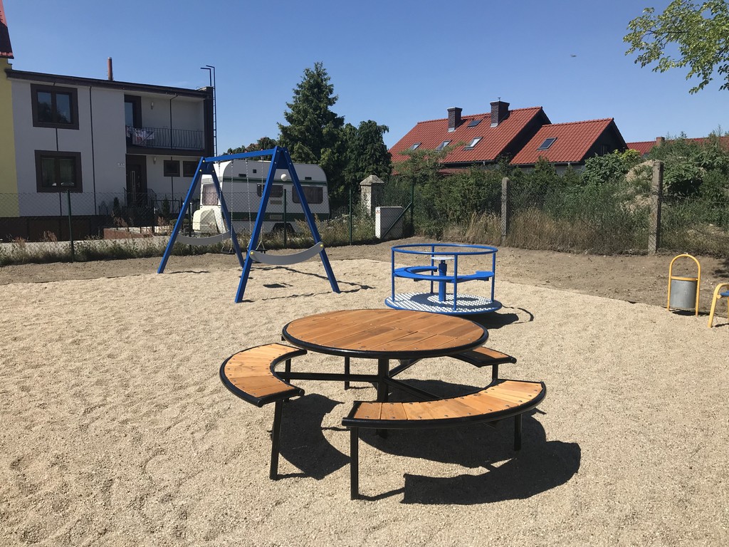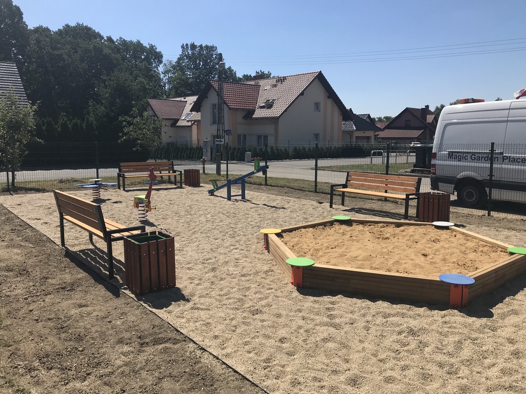 Zakres zadania obejmował także montaż małej architektury m.in. ławek i stojaków na rowery, wykonanie nowej trawiastej nawierzchni oraz przebudowę ogrodzenia.