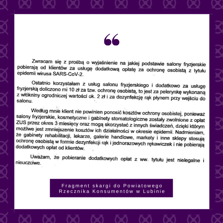 Wielu klientów nie zgadza się na ponoszenie kosztów dodatkowej ochrony sanitarnej. Nie zawsze są też z odpowiednim wyprzedzeniem informowani o opłacie covidowej. Niektórzy dowiadują się o niej dopiero, gdy przychodzi do płacenia. Skargi w tej sprawie zaczęły wpływać także do Wiesławy Sulimy, Powiatowego Rzecznika Konsumentów w Lubinie.