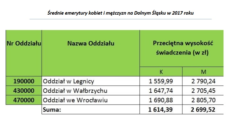 Ponad tysiąc złotych mniej dostają emerytki mieszkające na Dolnym Śląsku. Jest to skutek mniejszych zarobów kobiet, niższego wieku emerytalnego pań, oraz tego, że żyją dłużej niż mężczyźni. Po obniżeniu wieku emerytalnego kobiety w Polsce mogą zakończyć pracę, gdy osiągną 60 lat, mężczyźni pracują do 65 lat.