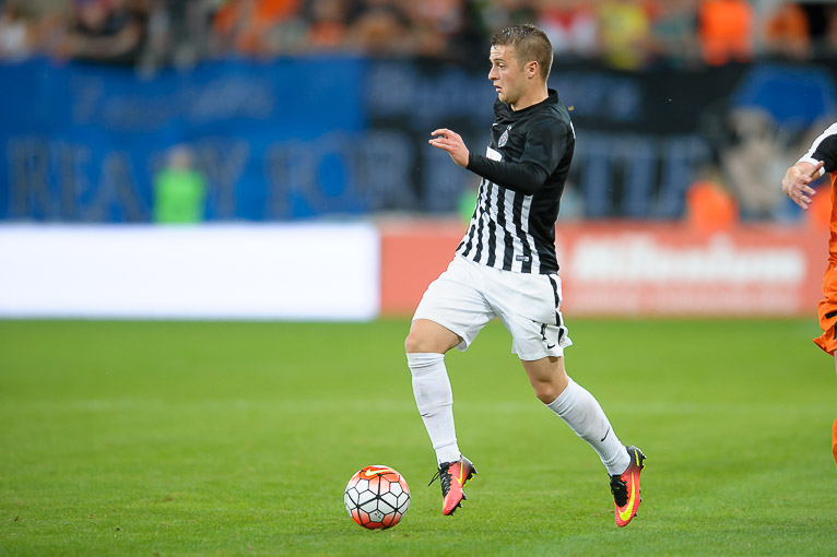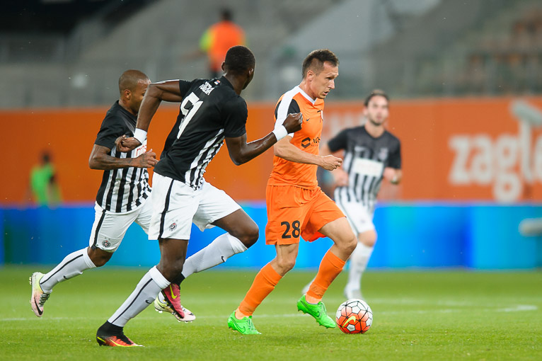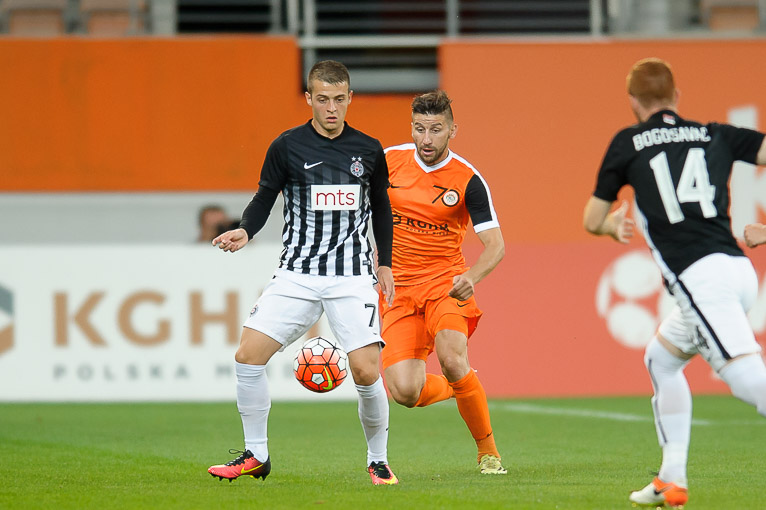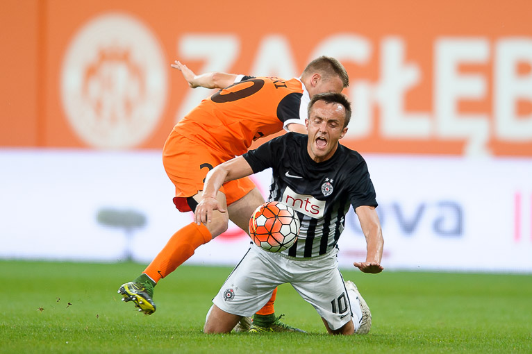 Już od pierwszych minut to goście dyktowali warunki spotkania w Lubinie. Partizan dominował momentalnie zamykając KGHM Zagłębie pod swoją bramką. Taki napór trwał jednak tylko dziesięć minut, a potem zobaczyliśmy już całkiem inną drużynę Piotra Stokowca. Wszystko zaczęło się od dość ekwilibrystycznego uderzenia Lubomira Guldana w 11. minucie. Siedem minut później z 25 metrów zaskoczyć bramkarza próbował Krzysztof Piątek, jednak piłka nieznacznie minęła słupek bramki Saranova. W 32. minucie lubinianie znów dali się we znaki obronie Partizana. Najpierw kolejne uderzenie napastnika Miedziowych odbił bramkarz serbskiej drużyny, a następnie strzał Woźniaka nieznacznie minął słupek bramki rywala. Decydujące trafienie przed przerwą mogli jednak uzyskać również goście. W 43. minucie nieznacznie strzałem głową pomylił się jednak Bilhar.