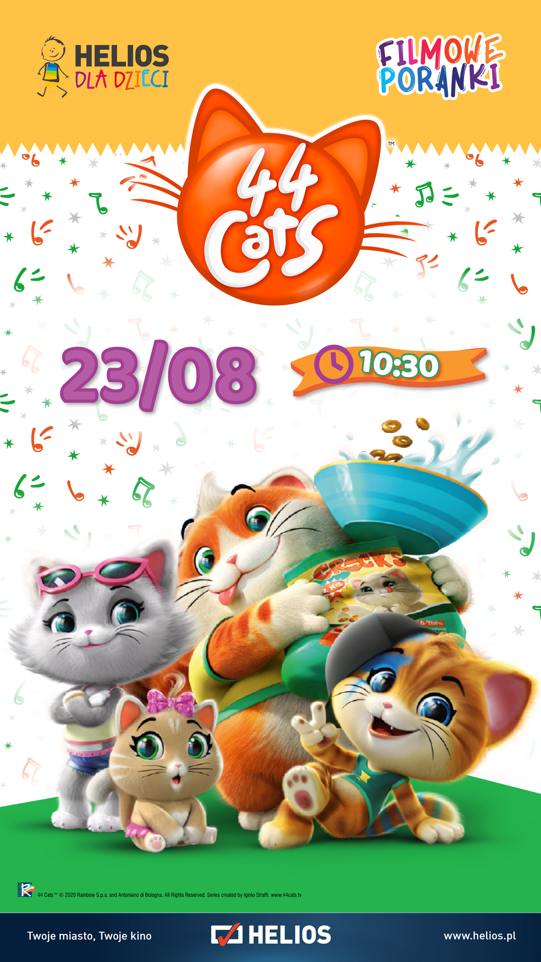 Co dwa tygodnie, w niedzielne poranki, kino Helios zaprasza najmłodszych widzów na wyjątkowe seanse w ramach projektu Helios dla Dzieci. Cykl przeznaczony jest dla dzieci w wieku od 4 do 8 lat, oczywiście w towarzystwie ich opiekunów. 23 sierpnia odbędzie się Filmowy Poranek z filmem „44 koty” – rozśpiewaną, włoską animacją dla przedszkolaków. Tradycyjnie, oprócz projekcji, Helios zagwarantuje także moc konkursów oraz wspólną zabawę.