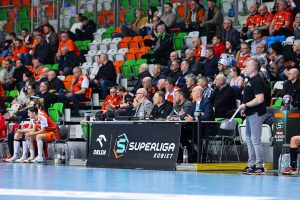 Początek spotkania był dość wyrównany. Obie drużyny postawiły na odważną grę w ataku, a po ośmiu minutach na tablicy wyników widniał remis 2:2. Chwilę później tempo meczu wyraźnie wzrosło, a bramki zaczęły padać częściej. Po dziesięciu minutach to mistrzynie Polski wyszły na prowadzenie 5:4, sygnalizując, że zaczynają przejmować kontrolę nad wydarzeniami na parkiecie.