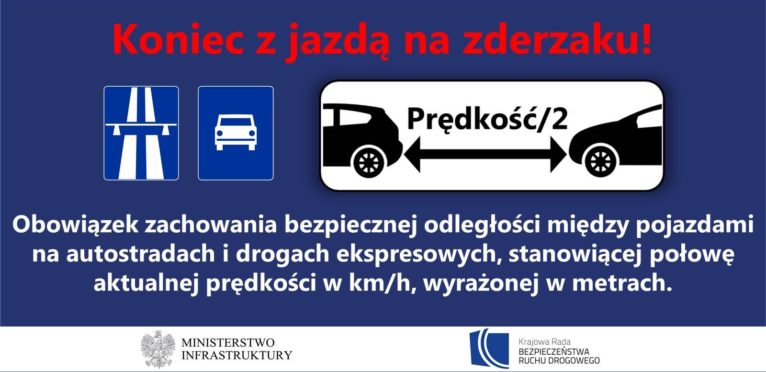 Zmiany wprowadzają także zakaz tzw. jazdy na zderzaku, czyli jazdy zbyt blisko następnego samochodu. Obowiązuje on na autostradach i drogach ekspresowych, gdzie odstęp między pojazdami ma być nie mniejszy niż połowa prędkości, z jaką porusza się dany pojazd. Oznacza to, że kierowca jadący z prędkością 100 km/h powinien jechać w odległości co najmniej 50 metrów za pojazdem go poprzedzającym. Wyjątkiem ma być manewr wyprzedzania.