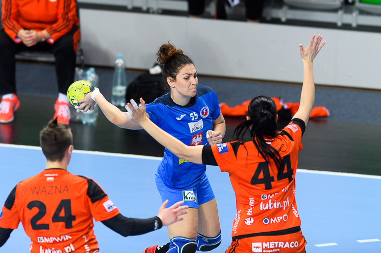 Pierwsza ofensywna akcja przyjezdnych zakończyła się faulem ze strony miedziowych, ale Andela Ivanović nie wykorzystała szansy i piłka po jej rzucie karnym trafiła w słupek. Wynik spotkania otworzyła ze skrzydła Kinga Grzyb, ale dwa z rzędu trafienia Moniki Kopertowskiej dały Piotrcovii pierwsze prowadzenie. Lubinianki szybko jednak zaczęły budować swoją przewagę i po dziesięciu minutach wygrywały 6:3. Chwilę później o czas poprosił szkoleniowiec przyjezdnych, przy wyniku 7:3. W grze Piotrcovii niewiele się zmieniło i to miedziowe zdobywały kolejne bramki. Po kwadransie na tablicy wyników było 9:4. Seria Victorii Belmas sprawiła, że chwilę później miedziowe wygrywały różnicą sześciu bramek. Po stronie ekipy z Piotrkowa najczęściej rzucały Monika Kopertowska i najbardziej doświadczona Agata Wypych. Nie do zatrzymania jednak była Kinga Grzyb, która rzucała jak na zawołanie. Pięć minut przed końcem pierwszej połowy na parkiecie pojawiła się Paulina Piechnik. Dla „Puko” był to pierwszy występ po długiej przerwie, spowodowanej kontuzją i żmudną rehabilitacją. Miedziowe, schodząc do szatni wygrywały wyraźnie, bo różnicą siedmiu trafień.