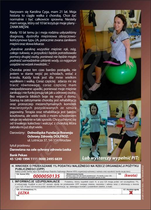 23-latce można też pomóc, przekazując jej 1 procent swojego podatku (szczegóły na załączonej poniżej ulotce).