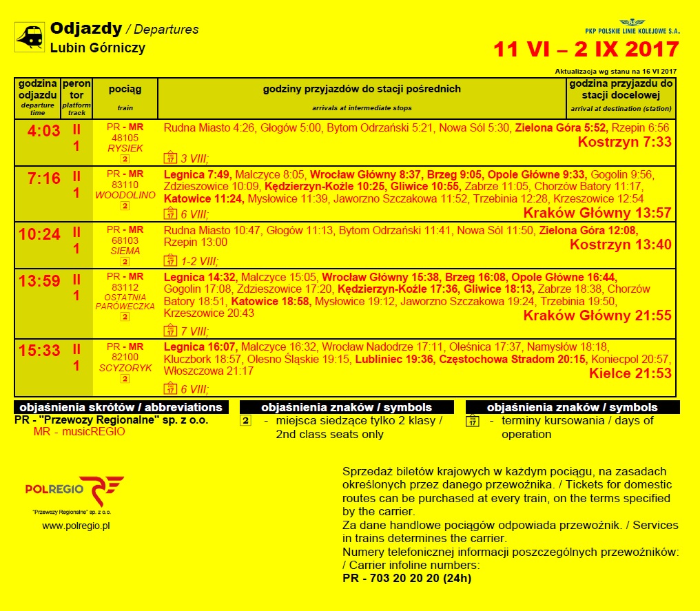 Rozkład pociągów odjeżdżających z Lubina publikujemy poniżej.