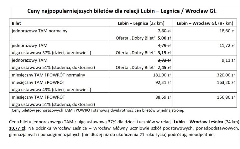 Z okazji przywrócenia połączeń pasażerskich między dwoma największymi miastami Zagłębia Miedziowego KD przygotowały specjalną ofertę promocyjną pt. „Dobry bilet”. To dobra wiadomość dla pochodzących z Lubina studentów legnickiej Państwowej Wyższej Szkoły Zawodowej – oni za bilet zapłacą zaledwie 2,45 zł. Normalny bilet będzie kosztował 5 zł.