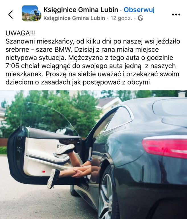 Po lokalnych grupach w mediach społecznościowych krąży wpis, który wzbudził spore poruszenie szczególnie wśród mieszkańców Księginic. Na facebookowym profilu Księginice Gmina Lubin pojawiło się ostrzeżenie o srebrnym lub szarym bmw, którego kierowca miał próbować wciągnąć do auta jedną z kobiet.