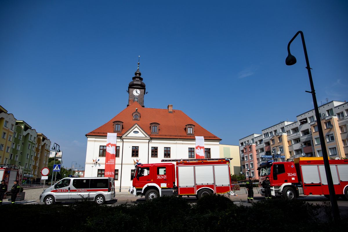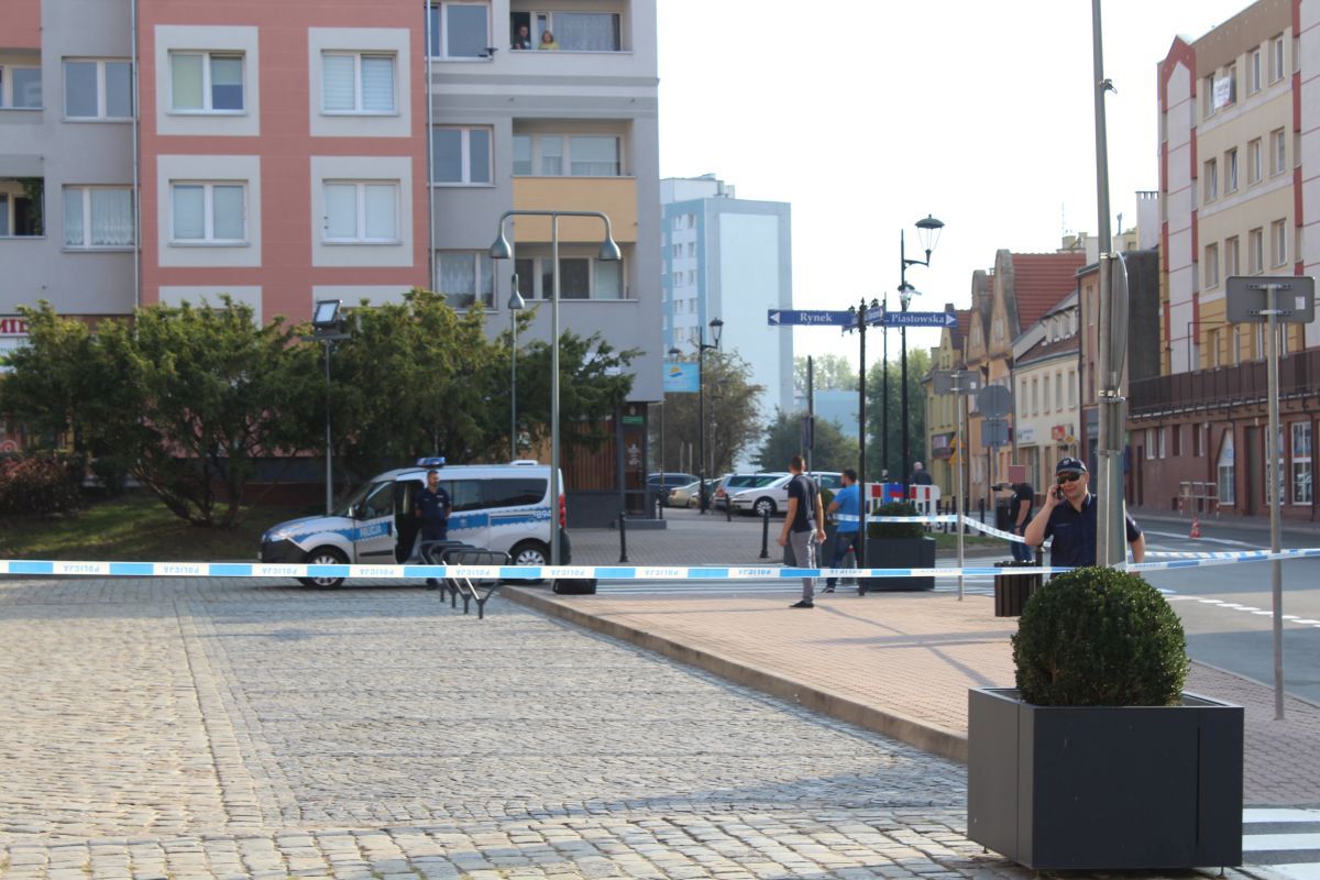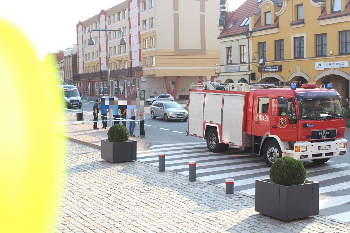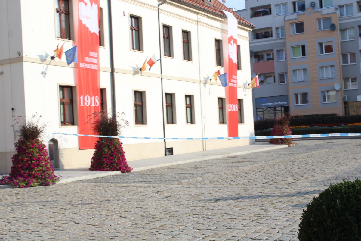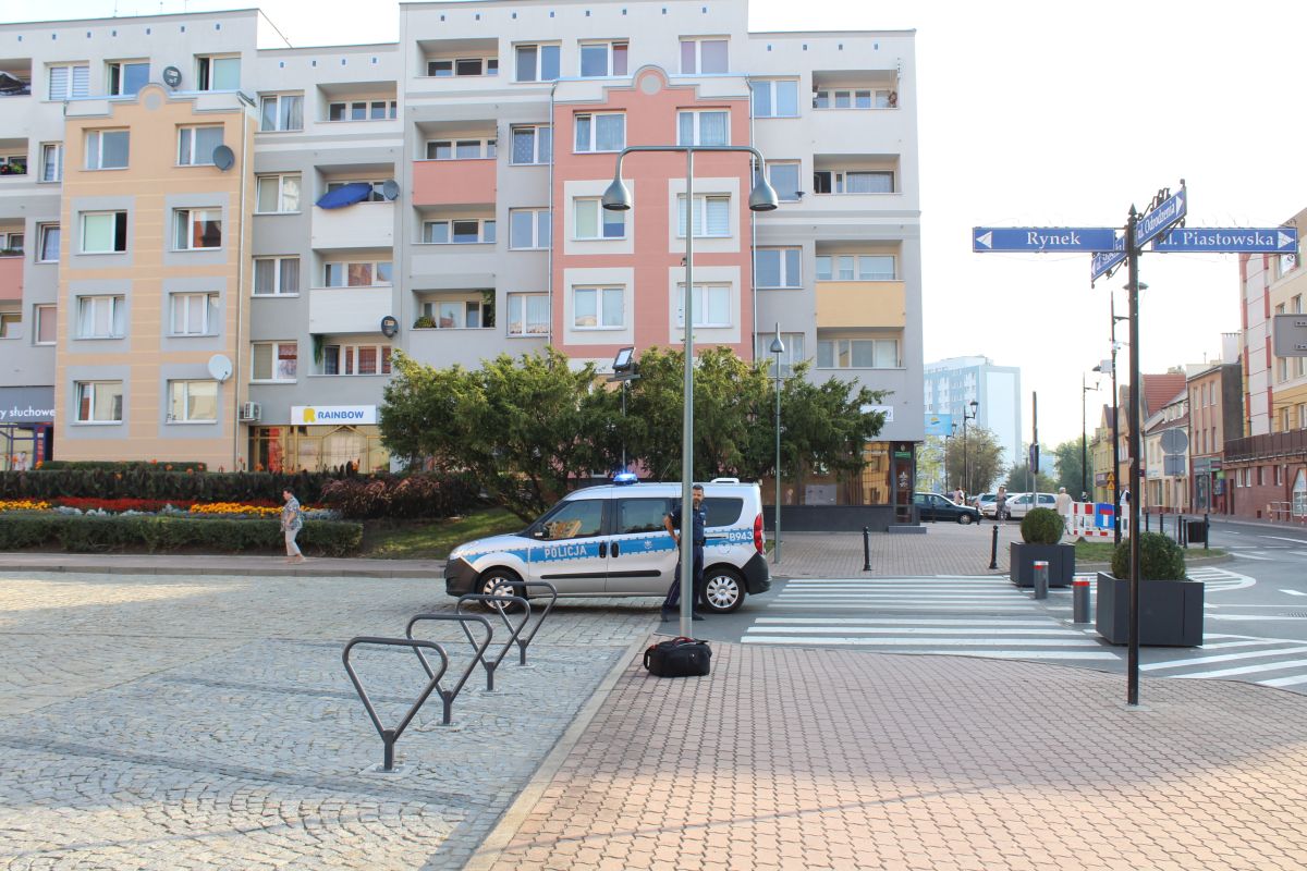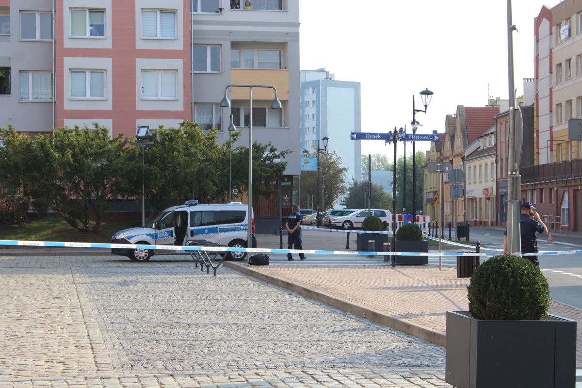 Policja zabezpieczyła teren przy fasadzie Ratusza od strony ul. Mieszka I i Odrodzenia. Funkcjonariusze pilnują, by nikt nie podchodził. Na miejsce wezwano też straż pożarną i ekipę pirotechników.