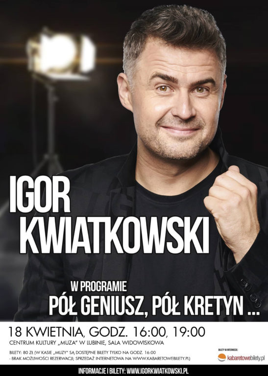 Sprawy obyczajowe, potyczki damsko-męskie, życiowe tarapaty męża i ojca, najświeższe trendy popkultury okiem Igora Kwiatkowskiego. 18 kwietnia będzie okazja, by w lubińskiej Muzie obejrzeć jego najnowszy program „Pół geniusz pół kretyn”.
