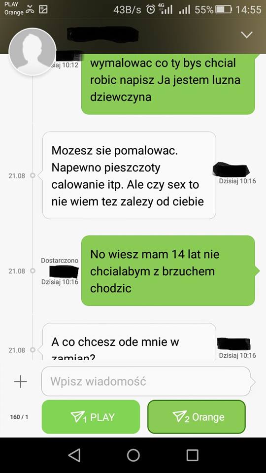 Dymkowski udostępnił też screeny ze swojego telefonu, pokazujące treść sms-ów od 27-latka. Pytał w nich m.in. o to czy nastolatka jest dziewicą, pisał, że zależy mu na pieszczotach i przytulaniu, a jeśli będzie chciała to także na seksie.