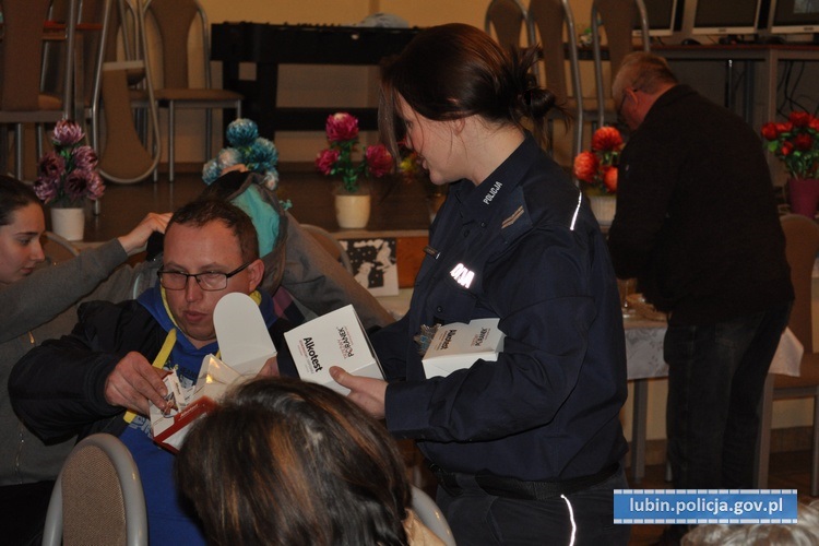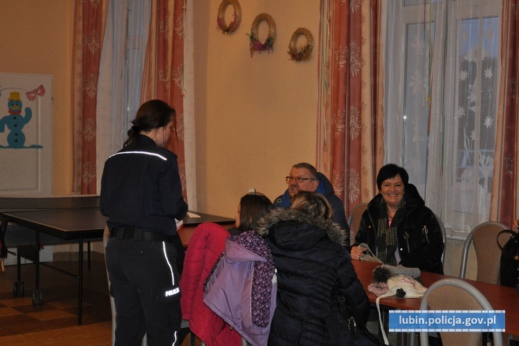 Jednym z zadań lubińskich policjantów jest podejmowanie na rzecz społeczności lokalnej różnego rodzaju działań z zakresu profilaktyki społecznej, w tym realizowanie założeń akcji i programów prewencyjnych, a także przestrzeganie przed zagrożeniami. Dlatego też st. sierż. Agnieszka Malmon omówiła bezpieczeństwo podczas zimowego wypoczynku. Kierowców przestrzegała przed sięganiem po alkohol oraz środki odurzające, w tym dopalacze, które stanowią bardzo często śmiertelne zagrożenie. Przypomniała też o obowiązku noszenia elementów odblaskowych po zmroku poza terenem zabudowanym.