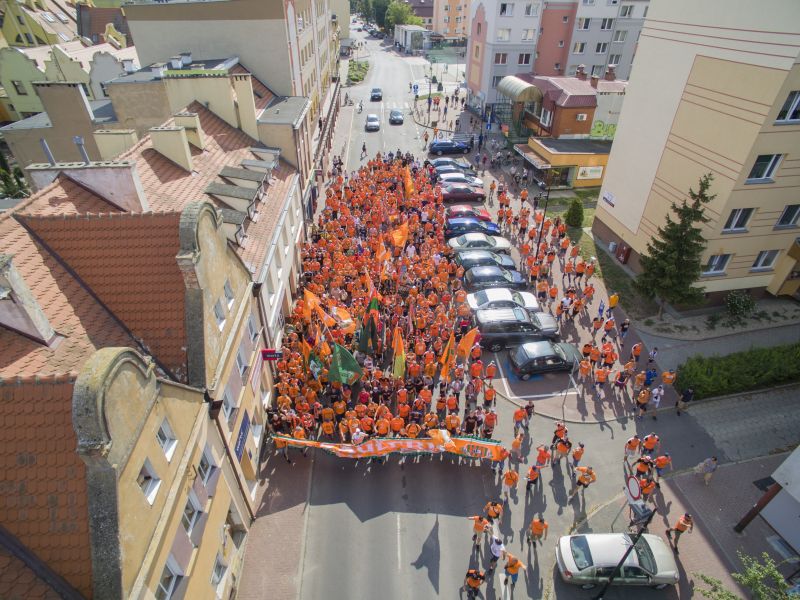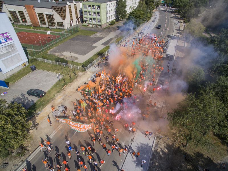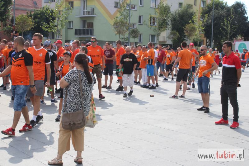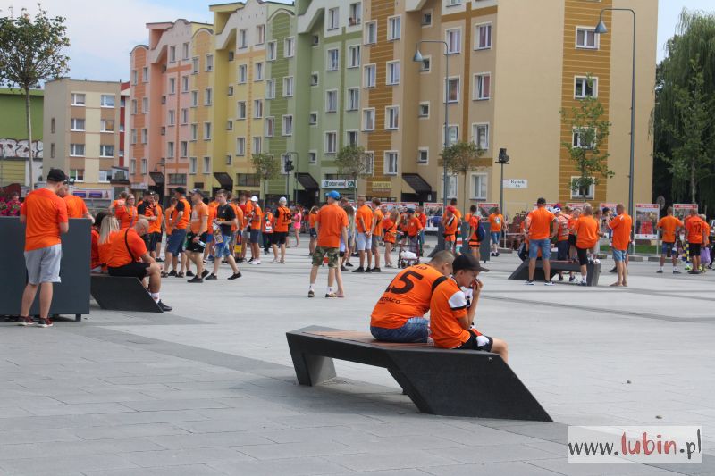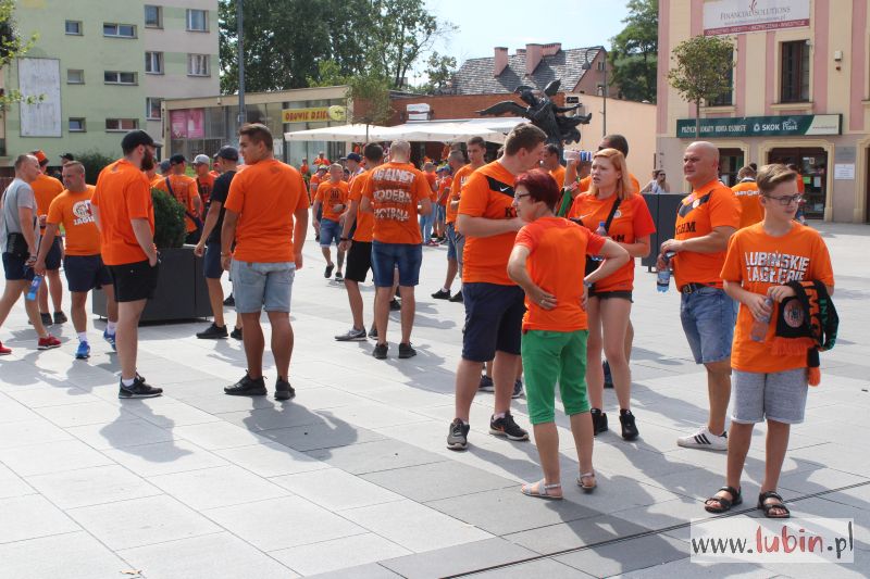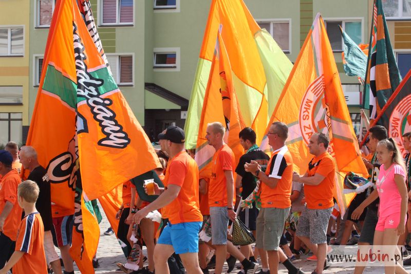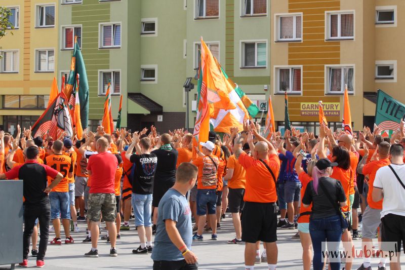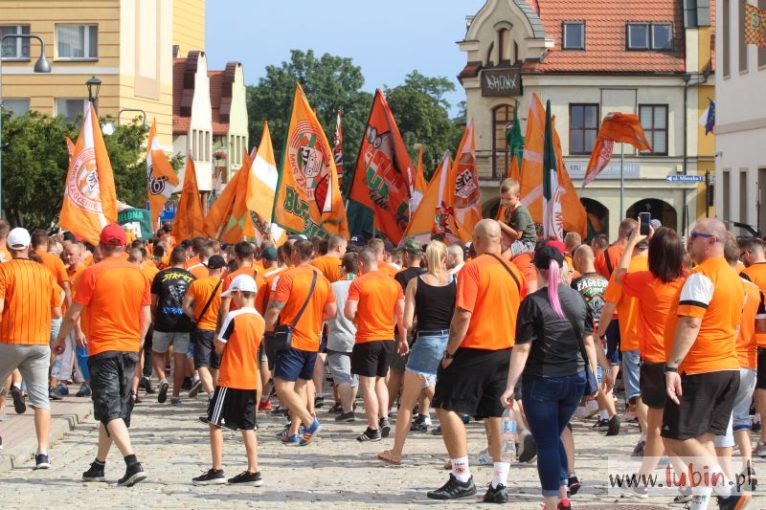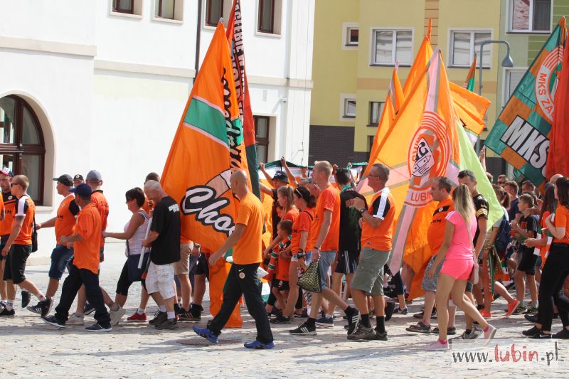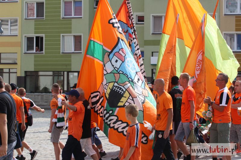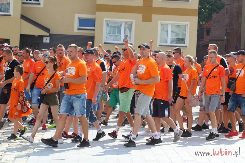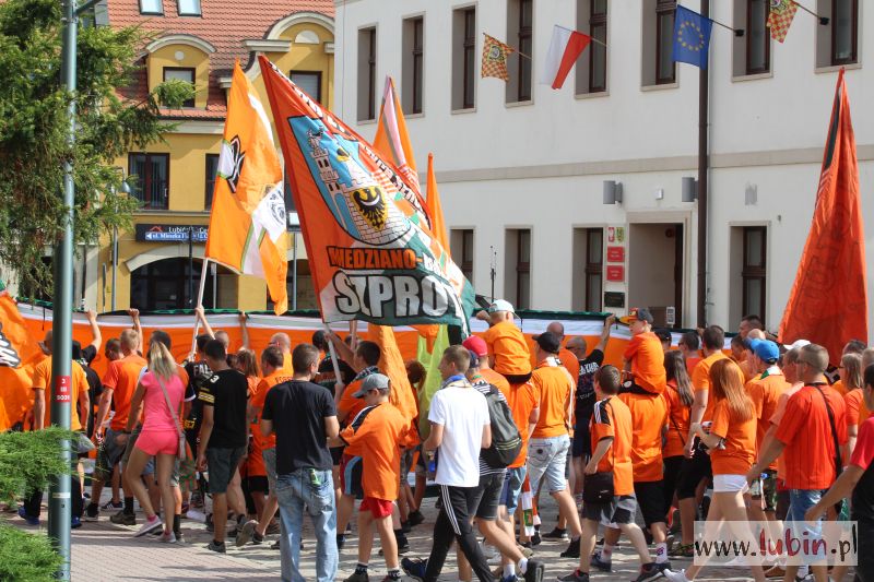 Tłum kibiców piłki nożnej, przemaszerował dzisiaj ulicami miasta na stadion Zagłębia Lubin.