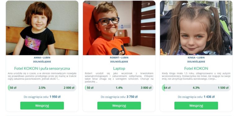 9-letni Robert, chorujący na stwardnienie guzowate i padaczkę, marzy o laptopie, 5-letnia Ania z autyzmem potrzebuje fotela typu kokon i pufy sensorycznej, a 4-letnia Kinga, u której zdiagnozowano autyzm wczesnodziecięcy – fotela kokon. Wszyscy są mieszkańcami Lubina i podopiecznymi Fundacji Dziecięca Fantazja, która stara się spełniać marzenia chorych dzieci.