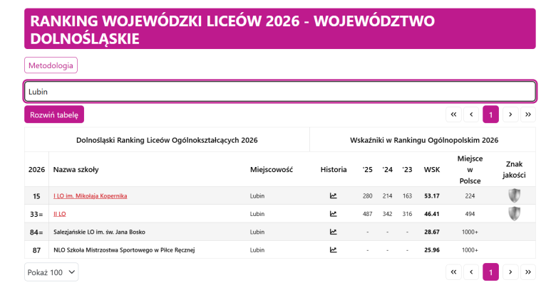 W rankingu dolnośląskich liceów znalazły się jeszcze Salezjańskie Liceum Ogólnokształcące – na miejscu 84., oraz Niepubliczne Liceum Ogólnokształcące Szkoły Mistrzostwa Sportowego w Piłce Ręcznej – na miejscu 87.
