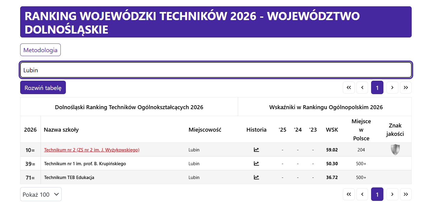 Zaś w rankingu placówek z Dolnego Śląska jest już nie tylko Technikum nr 2, które uplasowało się na 10. miejscu w województwie, ale i Technikum nr 1 – na 39. miejscu oraz Technikum TEB Edukacja – na 71. miejscu.