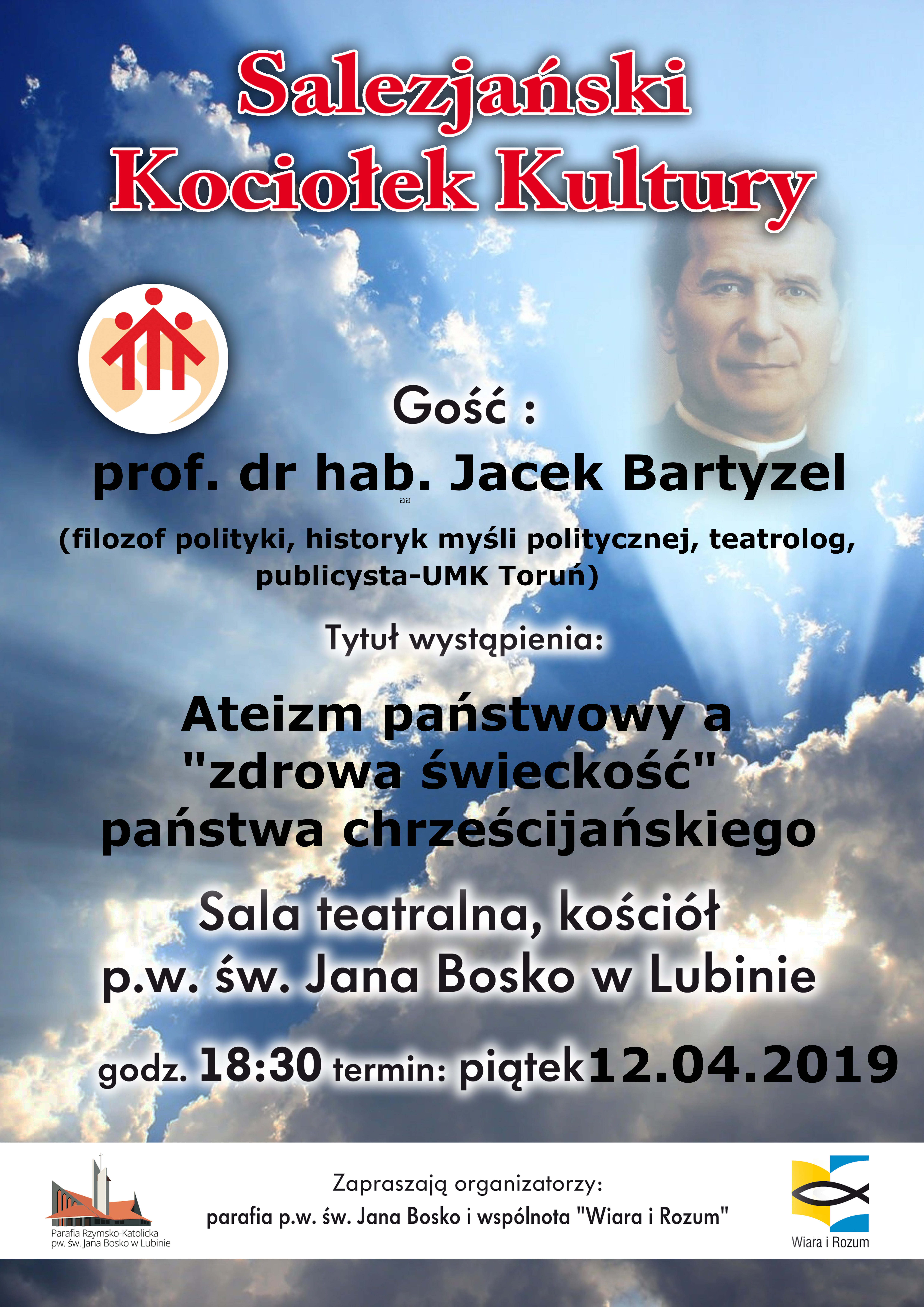 Parafia św. Jana Bosko w Lubinie i Wspólnota „Wiara i Rozum” zapraszają na kolejne spotkanie Salezjańskiego Kociołka Kultury, które odbędzie się w piątek 12 kwietnia 2019 roku o godz. 18:30 w sali teatralnej pod kościołem św. Jana Bosko w Lubinie. Tym razem zaproszenie przyjął prof. dr hab. Jacek Bartyzel, który wygłosi wykład dot. ateizmu.