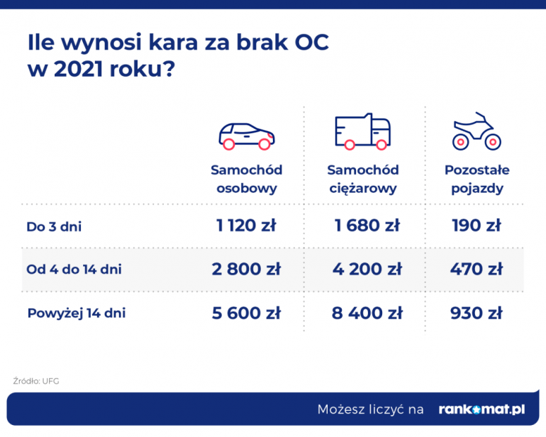 Za jazdę nieubezpieczonym pojazdem grożą również wysokie kary ze strony Ubezpieczeniowego Funduszu Gwarancyjnego (UFG). W 2021 r. za brak ważnej polisy OC powyżej 14 dni właściciel samochodu osobowego może zostać obciążony karną opłatą w wysokości 5 600 zł.