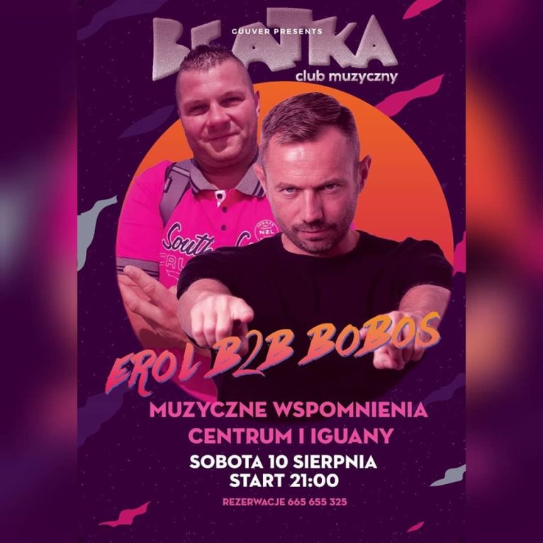 Duet Erol & Bobos zafundują najlepsze muzyczne uniesienia, bo w końcu to oni rozgrzewali parkiety tamtych klubów. Już w sobotę staną za sterami konsoli Beatki. – To będzie najlepsze B2B w Lubinie, jakie można sobie wyobrazić – zachęcają do przyjścia na imprezę organizatorzy.
