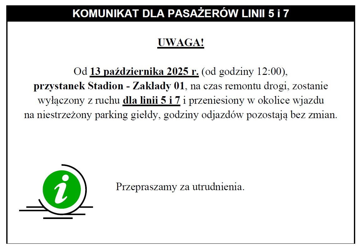 Chodzi o przystanek Stadion – Zakłady 01. Na czas remontu drogi od dziś został wyłączony z ruchu dla linii 5 i 7 i przeniesiony w okolice wjazdu na niestrzeżony parking giełdy. Godziny odjazdów pozostają bez zmian.