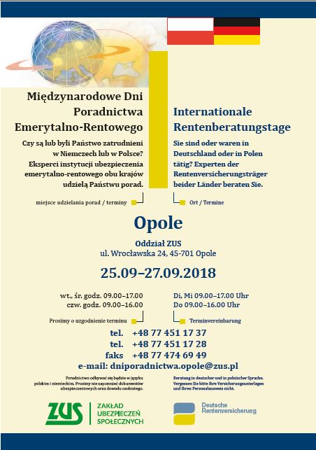 Konsultanci będą udzielać porad między 25 a 27 września w opolskim oddziale ZUS przy ul. Wrocławskiej 24, w godzinach od 9.00 do 17.00. Poradnictwo polsko-niemieckie cieszy się dużym zainteresowaniem, dlatego opolski ZUS już teraz zachęca do ustalenia daty i godziny osobistej konsultacji z polskim lub niemieckim ekspertem.