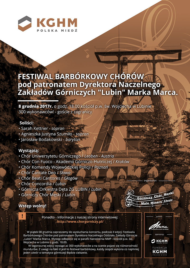 – Cały koncert odbywa się pod patronatem dyrektora Zakładów Górniczych Lubin Marka Marca. Serdecznie zapraszamy, wstęp na koncert jest bezpłatny – mówi dyrektor Górniczego Chóru Męskiego.
