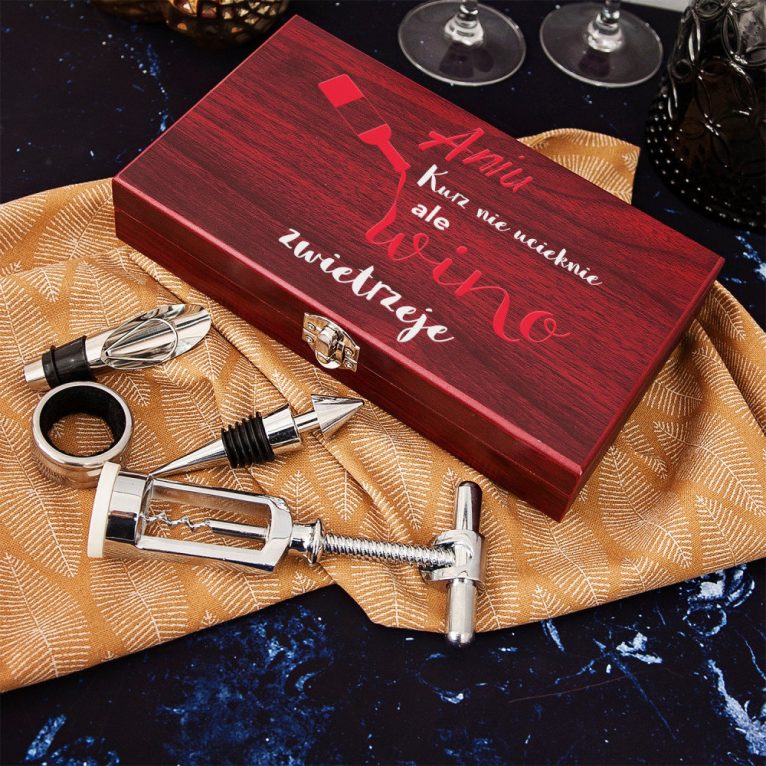 Jeśli bardziej od whisky woli czerwone chianti, sprezentuj mu elegancki zestaw do otwierania wina. Komplet składa się z korkociągu, 2 zatyczek oraz obrączki na szyjkę, która zabezpiecza przed kapaniem. Na skrzyneczce możesz umieścić zabawny napis. Wymyśl specjalną dedykację lub skorzystaj z gotowych życzeń dla Taty.