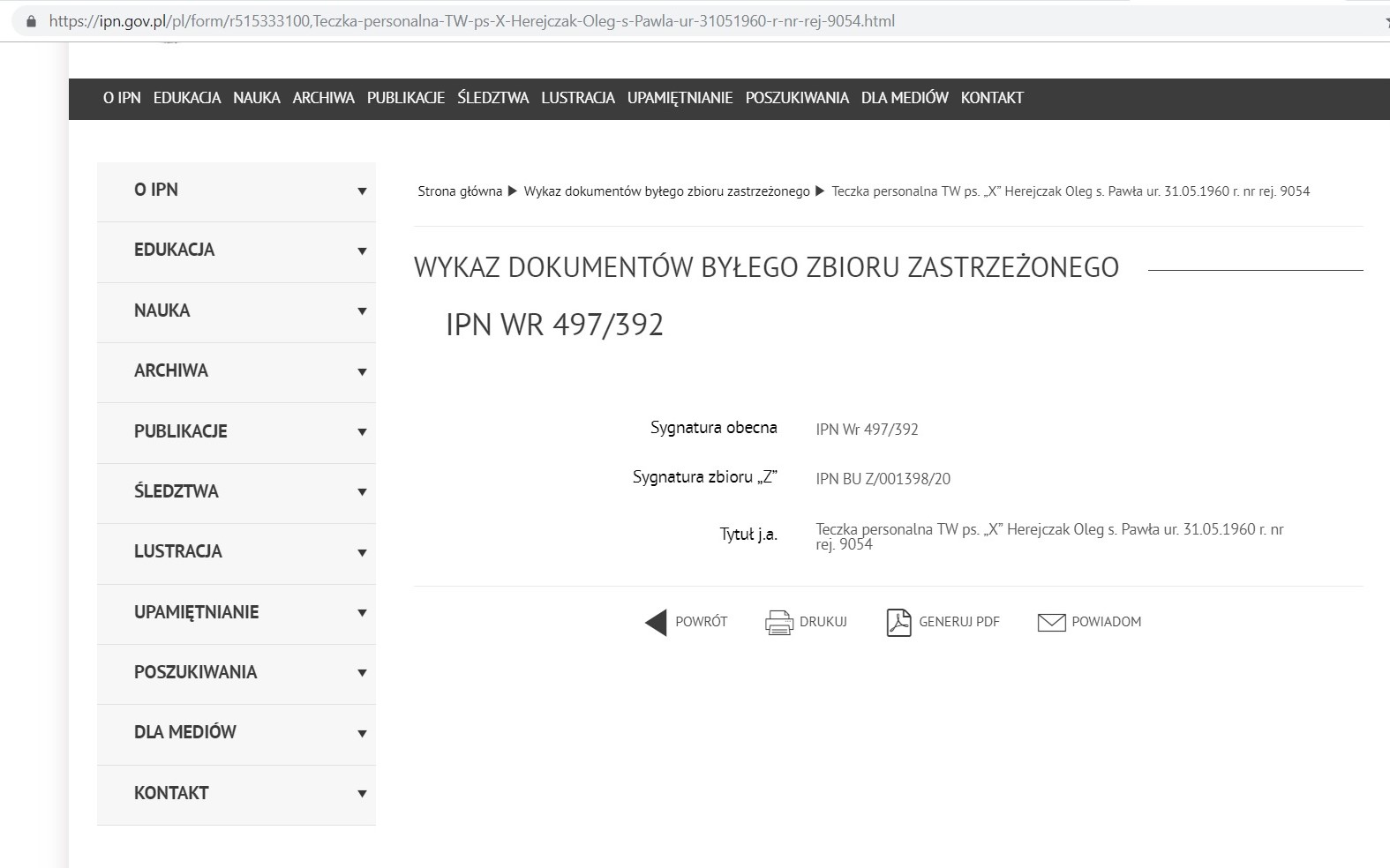 Domagając się sprostowania, radny Oleg Herejczak wysłał do nas zarządzenie o pozostawieniu jego sprawy bez dalszego biegu, podpisane przez Liliannę Ciepłoch, prokuratora Oddziałowego Biura Lustracyjnego we Wrocławiu. Wynika z niego, że we wrześniu 1988 roku został pozyskany i zarejestrowany przez wydział III KWMO w Legnicy jako kandydat na tajnego współpracownika, a następnie jako tajny współpracownik o pseudonimie X. „Pozyskania miano dokonać w celu zwalczania wrogich wobec PRL działań i wykorzystania w sprawie obiektowej o kryptonimie „Nadir” dotyczącej funkcjonowania Ukraińskiego Towarzystwa Społeczno-Kulturalnego w Legnicy, którego lustrowany (Oleg Herejczak – przyp. red.) był członkiem”.