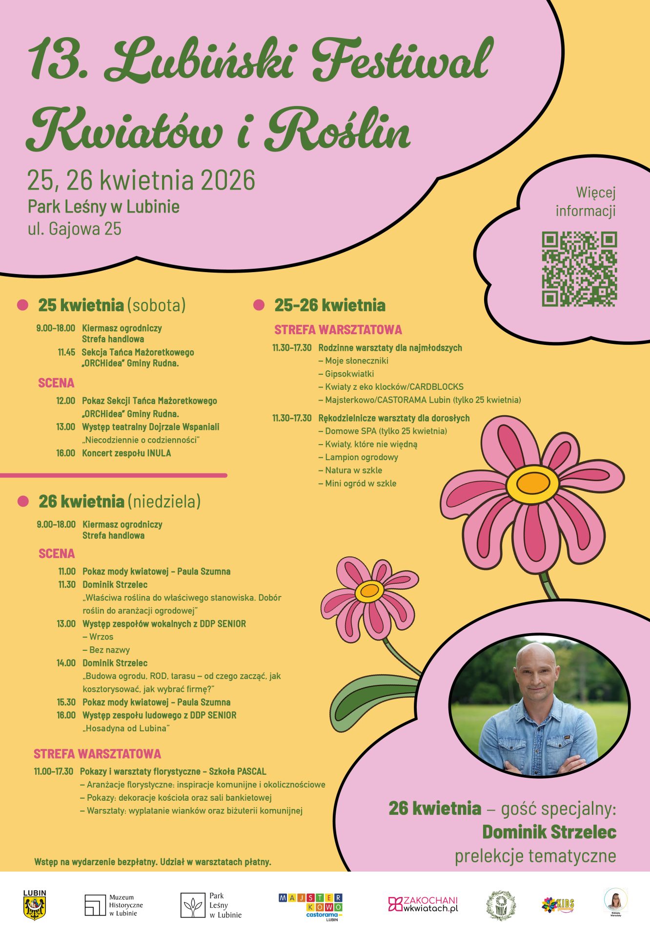 Integralną częścią festiwalu pozostaje rozbudowana strefa warsztatowa. Zarówno dzieci, jak i dorośli znajdą tu coś dla siebie – od kreatywnych zajęć plastycznych dla najmłodszych, po warsztaty rękodzielnicze, florystyczne i zielarskie dla starszych uczestników. W programie znalazły się również zajęcia przygotowane przez partnerów wydarzenia: Castorama Lubin w ramach projektu „Majsterkowo” oraz Szkołę Pascal w Lubinie, która zaprezentuje pokazy i warsztaty florystyczne.
