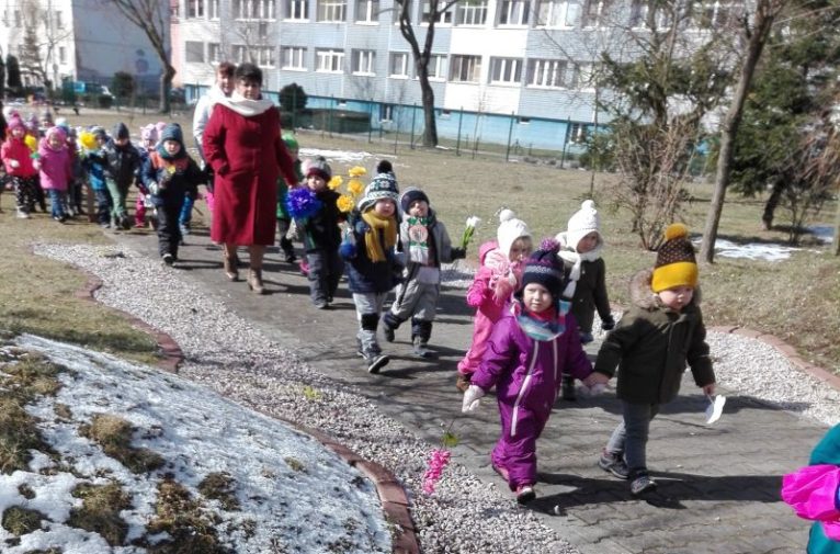 Następnie przedszkolaki przeszły ulicami osiedla. Dzieci ze wszystkich grup wiekowych, trzymając w dłoniach własnoręcznie wykonane kwiatki, ze śpiewem witały wiosnę.