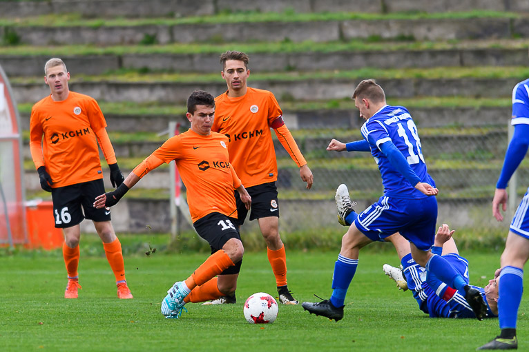 Spotkanie rozgrywane na Stadionie Górniczym idealnie rozpoczęło się dla gości, którzy w 6. minucie wyszli na prowadzenie po rzucie karnym wykorzystanym przez Patryka Porębę. Siedem minut później legniczanie prowadzili już dwiema bramkami, a swoje czwarte trafienie w tym sezonie zanotował Paweł Krauz. Moment niefrasobliwości w końcówce pierwszej połowy spowodował, że rezerwom KGHM Zagłębia udało się wyrównać a bramkę z rzutu karnego zdobył Konrad Andrzejczak.