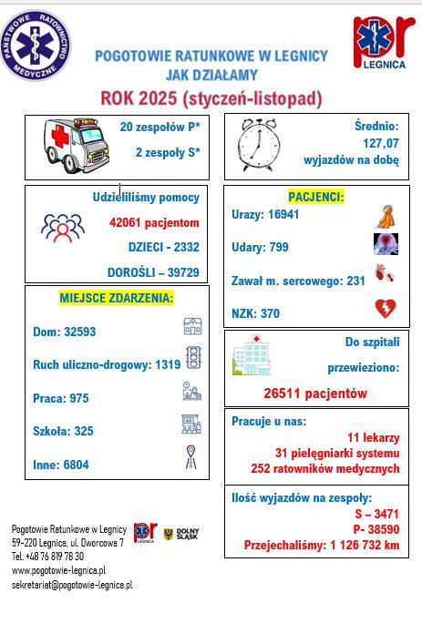 127 wyjazdów na dobę, ponad milion przejechanych kilometrów i pomoc udzielona 42 tysiącom pacjentów – tak w wielkim skrócie wygląda statystyczne podsumowanie jedenastu miesięcy mijającego roku w Pogotowiu Ratunkowym w Legnicy, w skład którego wchodzi także oddział lubiński.