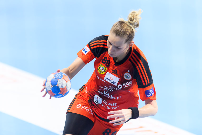 Dwie udane interwencje Moniki Maliczkiewicz w niespełna dwie minuty i bramki Małgorzaty Buklarewicz oraz Kingi Grzyb – tak zaczął się mecz dla miedziowych. Szczecinianki szybko jednak wróciły do gry i trafiły trzy razy z rzędu, wychodząc na pierwsze prowadzenie w szóstej minucie. Dwie minuty później, po bramce Patrycji Nogi Pogoń wygrywała 6:4. Chociaż kilka chwil później mieliśmy remis po 7, to szczecinianki znów odskoczyły na dwie bramki. Dobra gra w obronie, połączona ze skutecznymi kontrami sprawiła, że podopieczne Bożeny Karkut odrobiły straty i w dwudziestej minucie wyszły na prowadzenie 11:10.  Niestety później znów do głosu doszły przyjezdne, które przełamały barierę dwóch bramek różnicy. Trzy minuty przed przerwą na tablicy wyników było 12:15, ale zryw miedziowych w samej kocówce pozwolił zniwelować straty do jednej bramki.