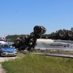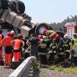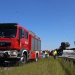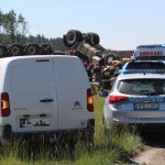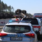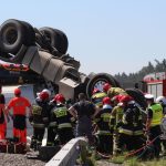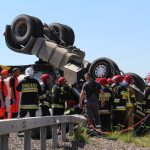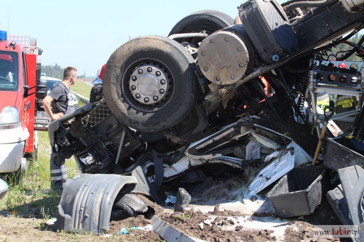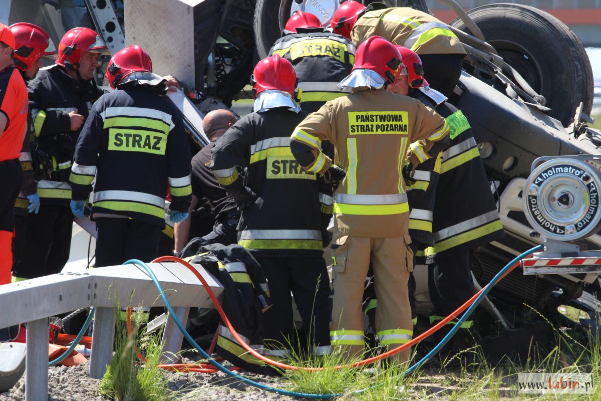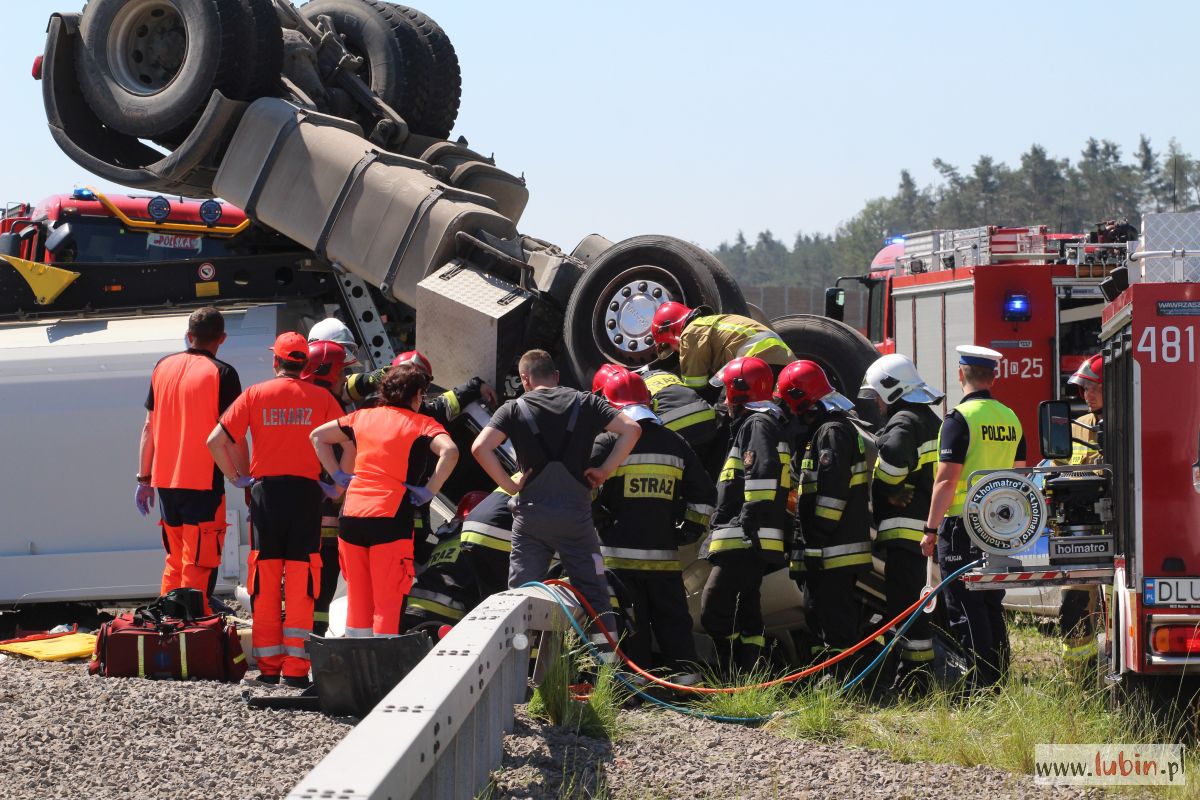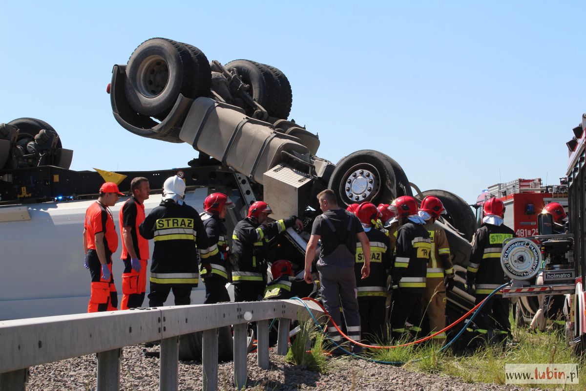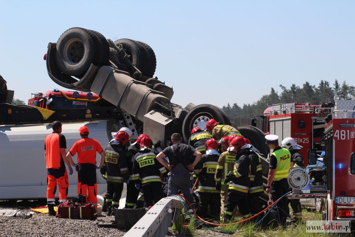 Przewrócona do góry kołami ciężarówka – takiego widoku można się spodziewać jadąc S3 w kierunku Legnicy. Ze zmiażdżonej kabiny ciągnika, kilkunastu strażaków próbuje wydostać zakleszczonego kierowcę.