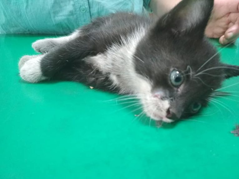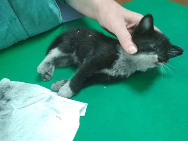 Pod szpitalem na Bema, na parkingu między apteką a SOR-em, znaleziono 4 koteczki. Jeden martwy, z pogruchotaną czaszka, złamaną wzdłuż żuchwą i oderwaną skórą od szczęki, drugi z niedowładem kończyn tylnych i dwa „sprawne”, ale odwodnione. Biało-bury odzyskał trochę siły po dwóch godzinach czekania na patrol policji po posiłku, wodzie i spaniu na zmianę. Kociaki prawdopodobnie wyrzucono, jeden maluch został najprawdopodobniej zabity, drugi ma poważne obrażenia.