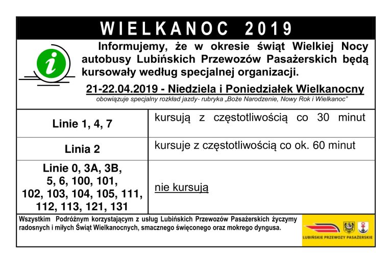 Szczegółowy rozkład jazdy Lubińskich Przewozów Pasażerskich można znaleźć na przystankach autobusowych. Pasażerowie powinni szukać rubryki: „Boże Narodzenie, Nowy Rok i Wielkanoc”.
