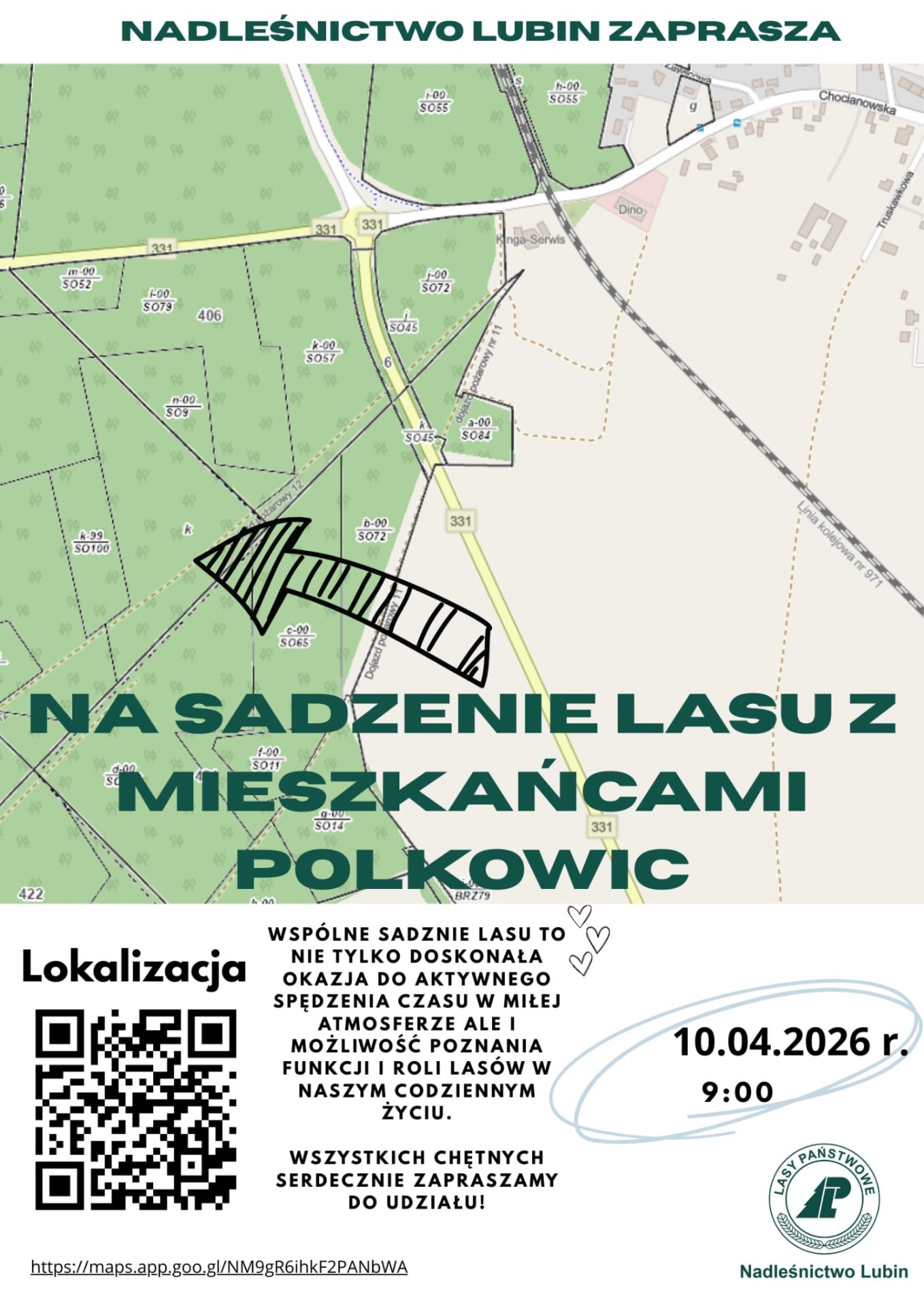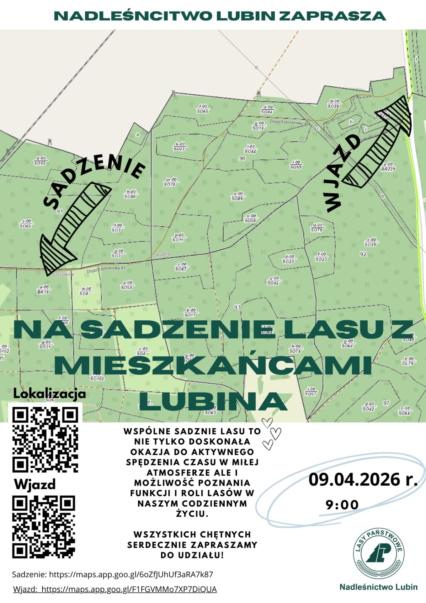 Akcja dla Lubinian zaplanowana jest w rejonie leśnictwa Żelazny Most. Dokładna lokalizacja na naszym telefonie wyświetli się po zeskanowaniu kodu QR na plakacie obok (13 km od Lubina, około 17 min jazdy samochodem). Jak mówią leśnicy, wspólne sadzenie drzew to nie tylko doskonała okazja do aktywnego spędzenie czasu w miłej atmosferze, ale i na możliwość poznania funkcji i lasów w naszym codziennym życiu.
