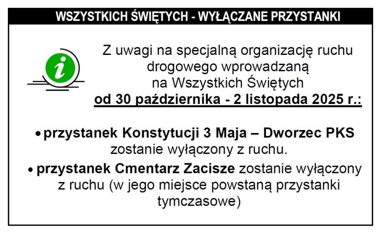 Zaś od 30 października do 2 listopada przystanek cmentarz Zacisze znajdujący się przy bramie głównej cmentarza przeniesiony zostanie w rejon dojazdu do parkingu.