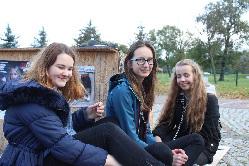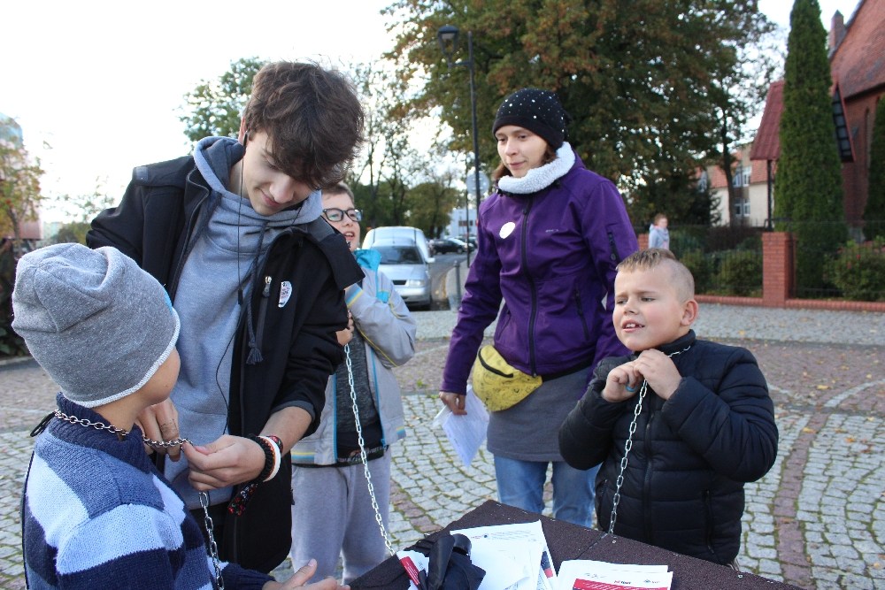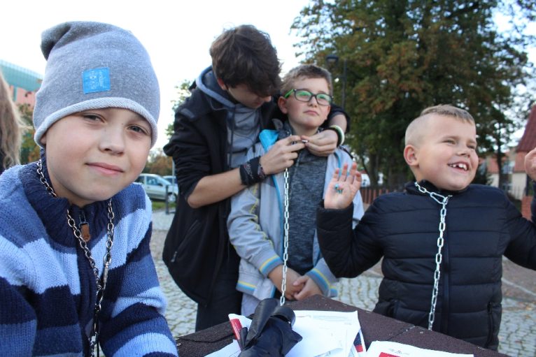 Do ustawionej przy ul. Piastowskiej budy chętnie przypięli się nawet najmłodsi, którzy zapewniali, że łańcuch jest lekki i wygodny, ale… tylko na chwilę.