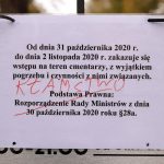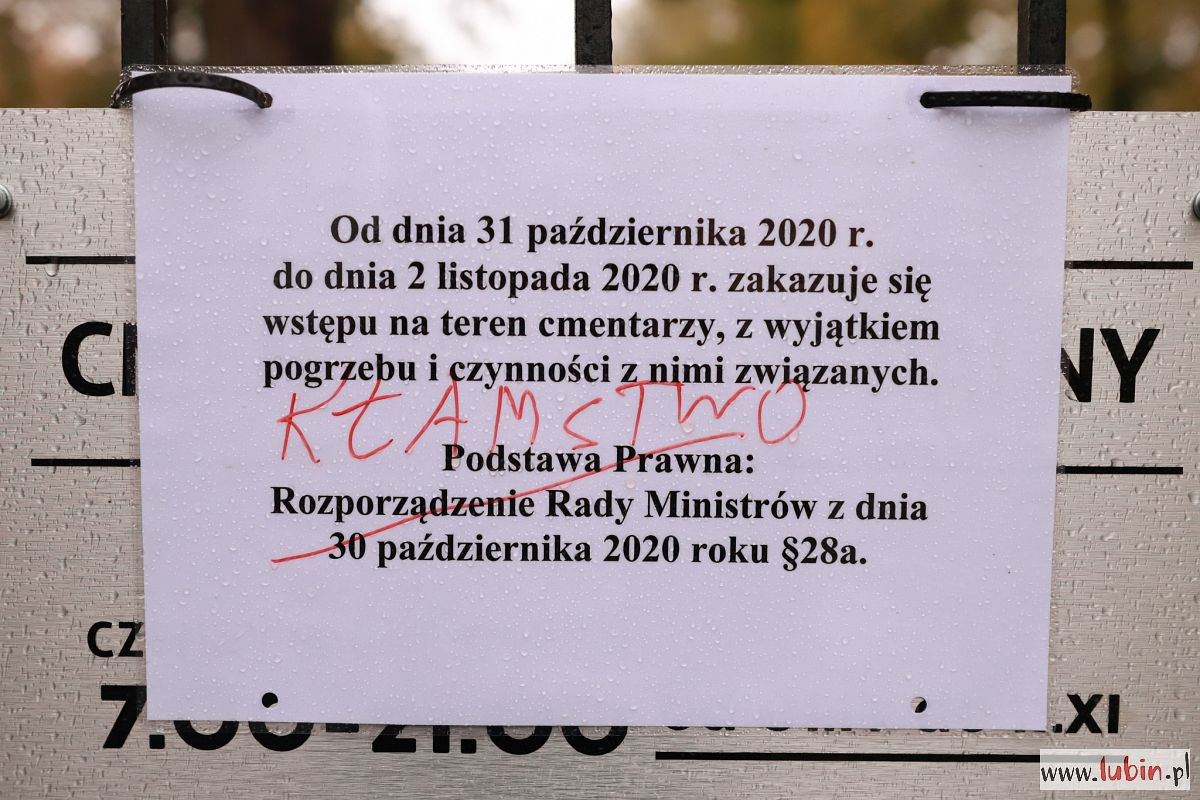 Zgodnie z obostrzeniami lubińskie nekropolie zamknięte są od wczoraj. Na informacji umieszczonej na bramie ktoś czerwonym markerem wypisał słowo „Kłamstwo”.